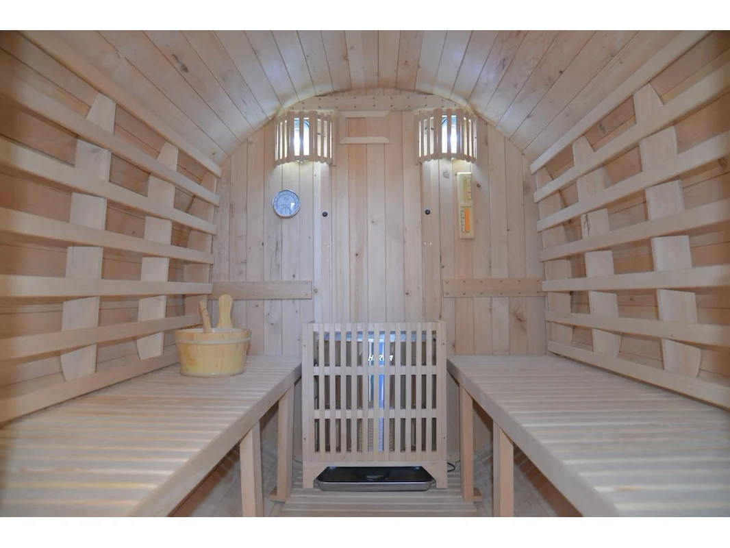 1x Buitensauna Barrel: getint glas, houtsoort: Canadian Hemlock; geschikt voor 4-6 personen, inclusief: thermometer, hygrometer, glazen zandloper, glazen sauna deur, 6KW kachel 'Harvia' op hout, afmeting: 2200x196 cm (LxH) Gewicht: Circa 500kg