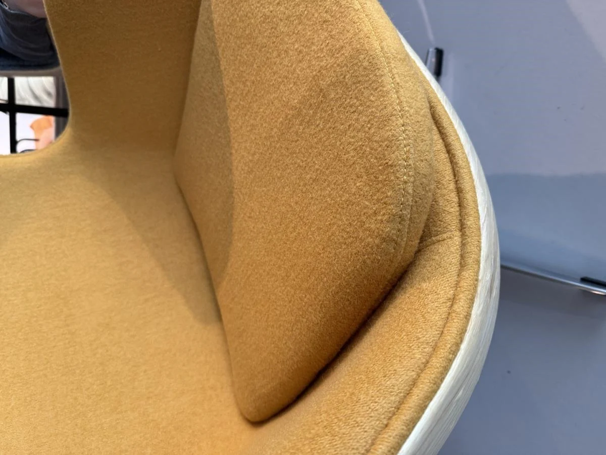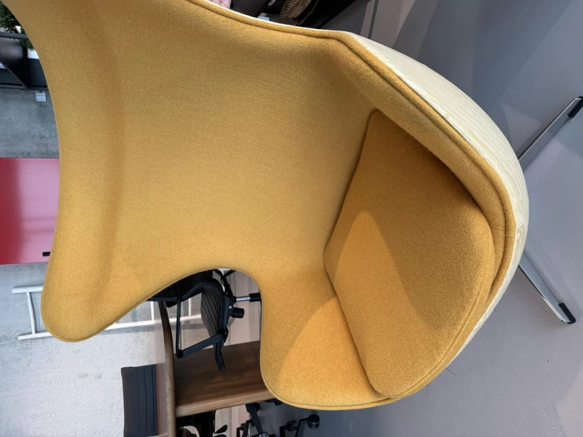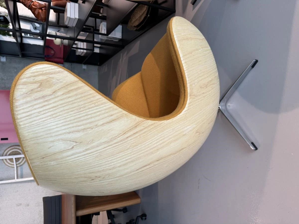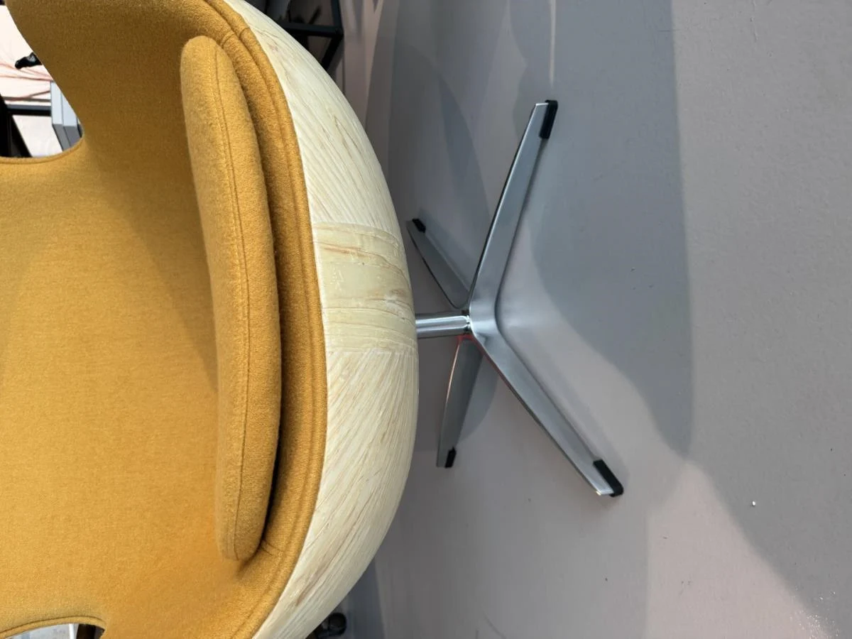 1x Egg Chair geel fineer frame, kasmier stof, vintage look, kruispoot, draaibaar onderstel, draai en kantelbaar Let op: Bij afhaling van de goederen dient u deze zorgvuldig te controleren. Na afhaling is retour of na-service niet mogelijk. Indien u niet aanwezig bent op de afgesproken afhaaldag, worden extra kosten in rekening gebracht.