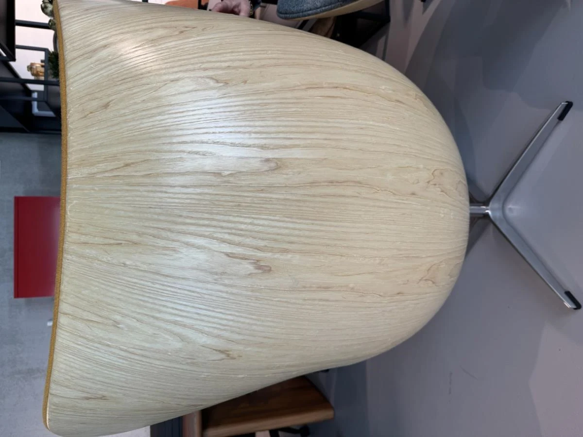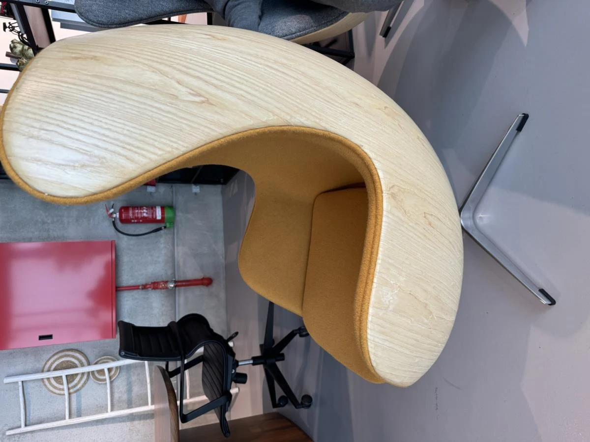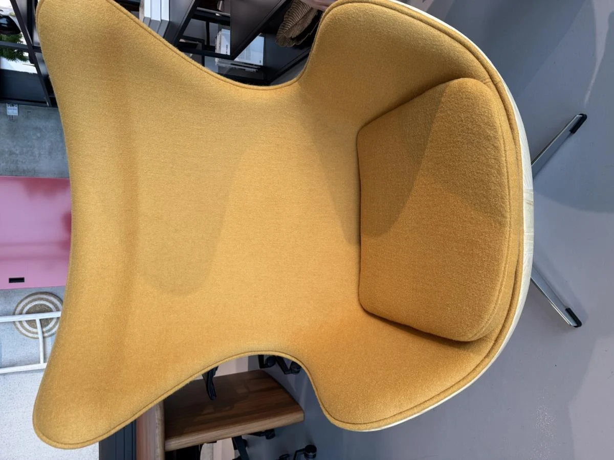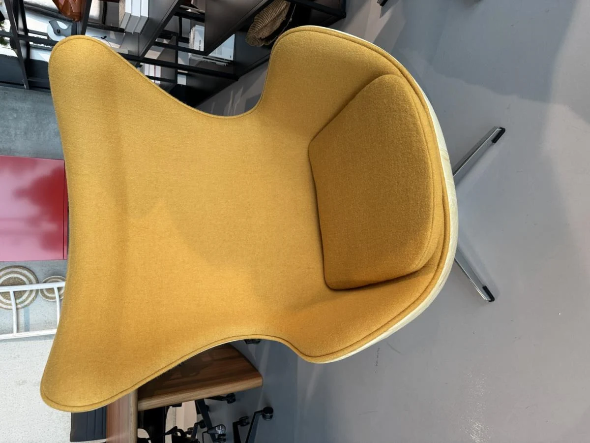 1x Egg Chair geel fineer frame, kasmier stof, vintage look, kruispoot, draaibaar onderstel, draai en kantelbaar Let op: Bij afhaling van de goederen dient u deze zorgvuldig te controleren. Na afhaling is retour of na-service niet mogelijk. Indien u niet aanwezig bent op de afgesproken afhaaldag, worden extra kosten in rekening gebracht.