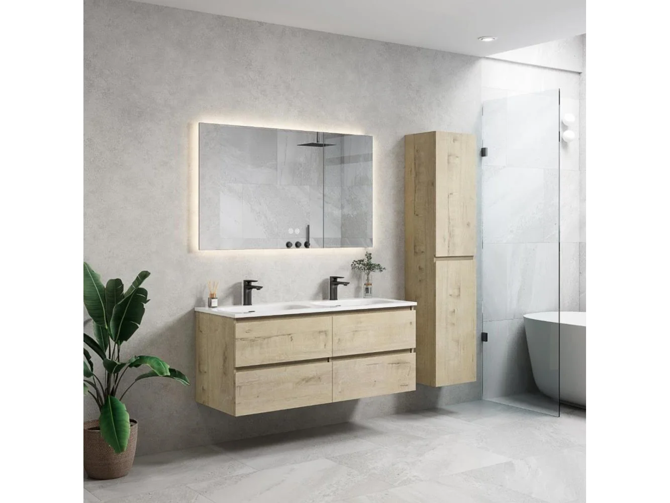 1 x 120 cm Design Badkamermeubel - ROMA 120-07 - Melamine - Kleur: Licht EIK - Afm. B120xH50xD46CM - LED Spiegel 120x70cm (Verschillende kleurtemperaturen 3000K Warm-wit, 4000K Neutraal-wit, 6500K Koud-wit) + Anti Condens + Alle 3 de kleuren zijn dimbaar, zo kunt u het licht eenvoudig dimmen of feller maken tot het gewenste effect - Mineraalmarmer wastafel- de onderbouwkast van het badkamermeubel bevat 4 laden en is uitgevoerd met een soft close systeem - kraan, krepin, sifon en kolomkast niet inbegrepen -