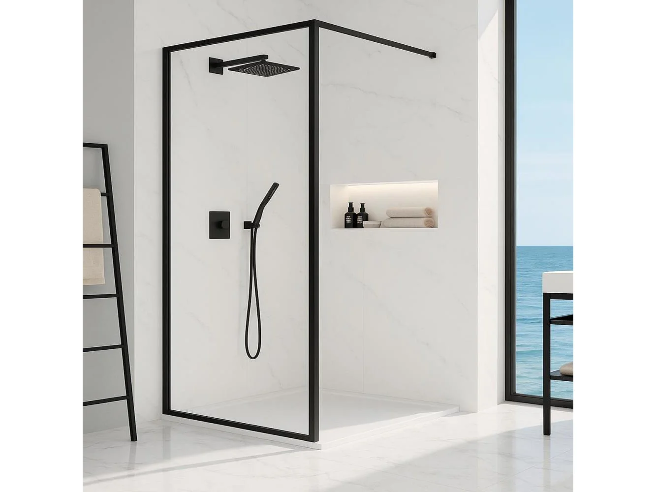 1 x 90 x 200 - Antikalkbehandeling - NANO-EASY CLEANING GLAS; B 860 x H 2000 mm - Mat zwart kader profiel breedte 25 mm - Mat zwart muur profiel breedte 30 mm - Veiligheidsglas Glasdikte 8 mm - 100 cm mat zwart stabilisatiestang inclusief - 90BCF