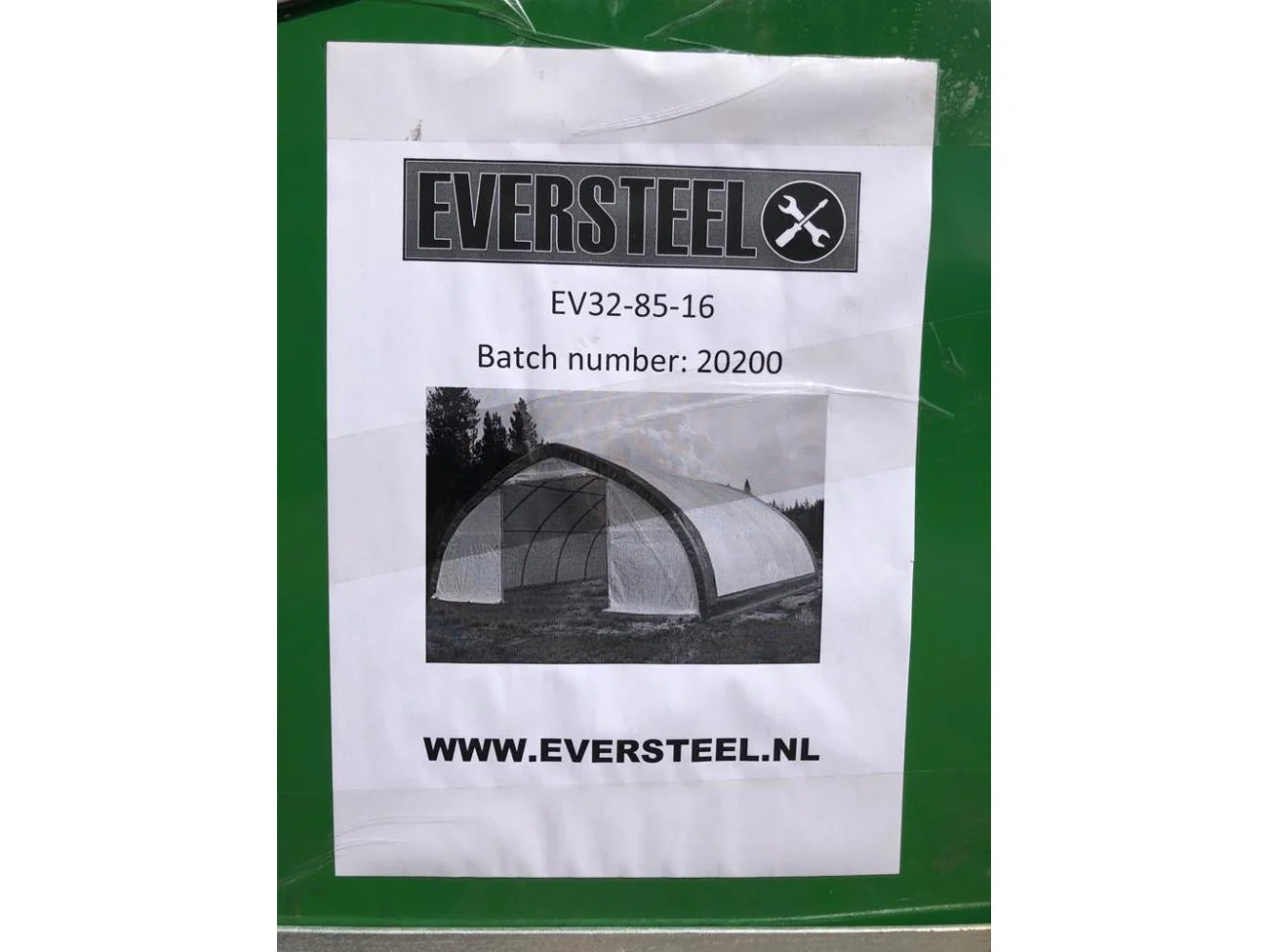 Eversteel Opslag tent/Storage Building, afmeting: 26x10x4,5 mtr, 1380 kg, gegalvaniseerde buizen, met oprolbare deur (maat: 3,5x3,5 mtr) verpakt in ijzeren krat.