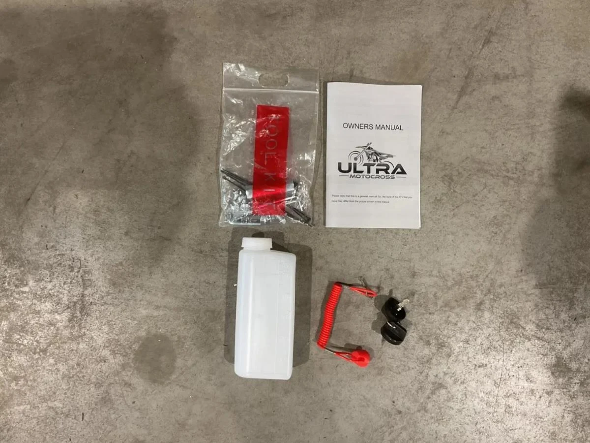 Voorzien van 49 cc benzine motor met electrische start, schrijfremmen voor en achter; 2 sleutels; dodemansknop en koord; voor bumper; inclusief toebehoren; ongebruikt in doos