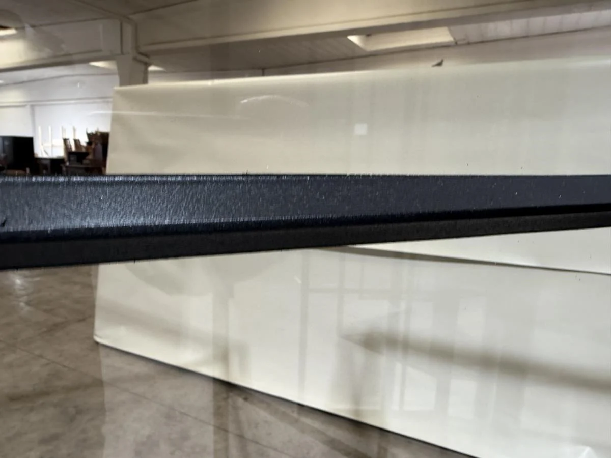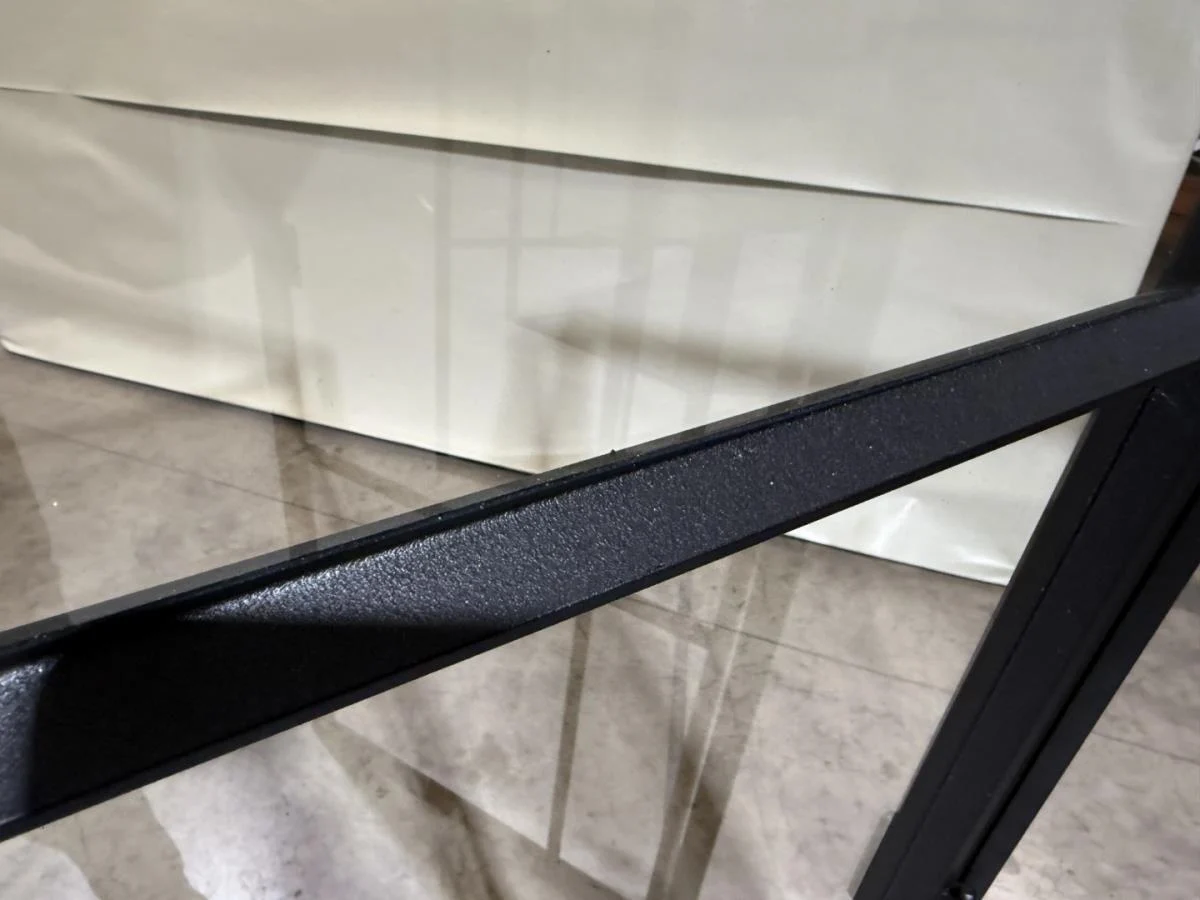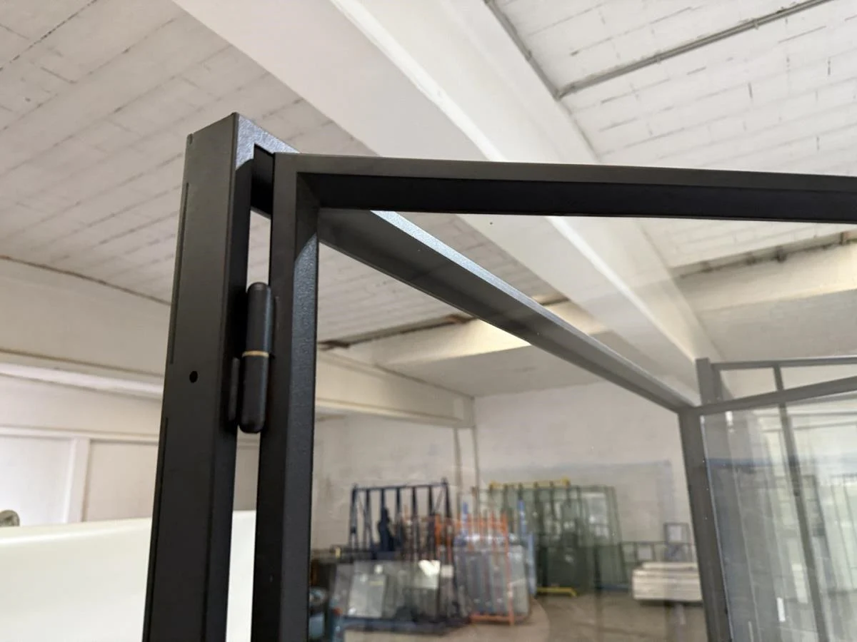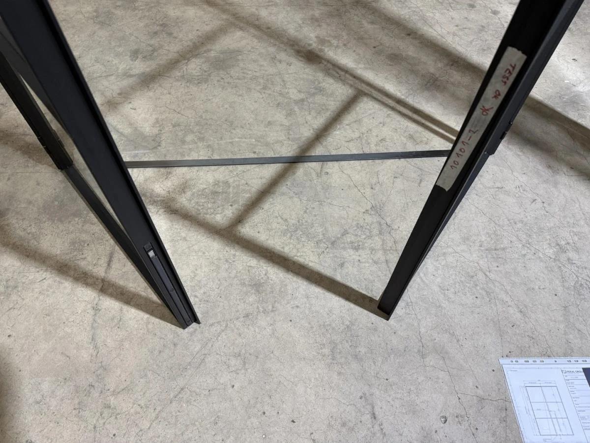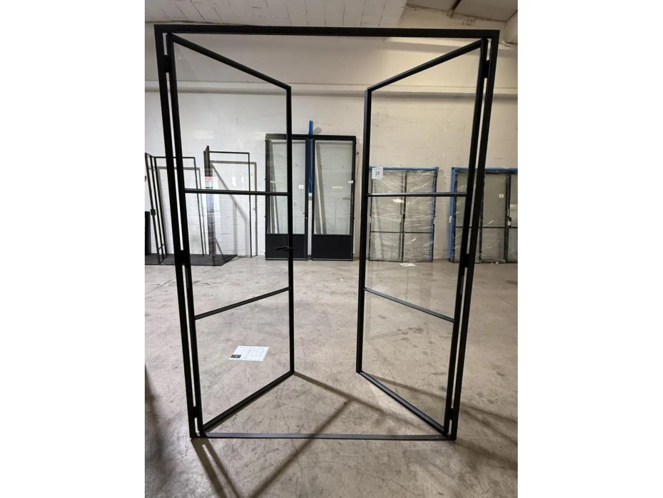 Stalen dubbele binnendeur voorzien van 3 onderverdelingen per deur Opgebouwd uit kokerprofielen 40 x 15mm Heldere veiligheidsbeglazing Gezandstraald en gepoederlakt RAL 9005 zwart Artisanaal afgemastikeerd aan 2 zijden HXB:2200x1600mm Verkoopprijs 2750€