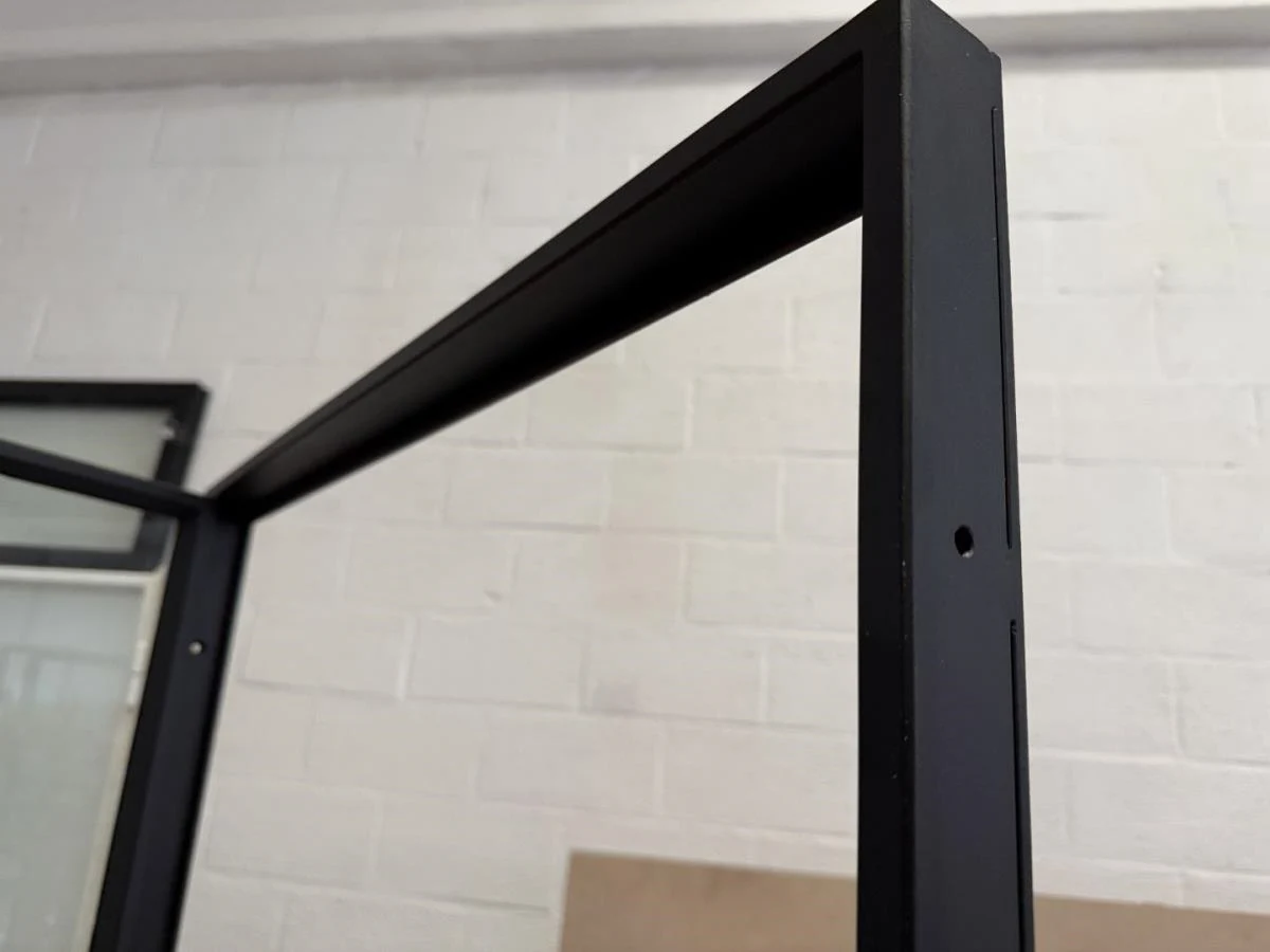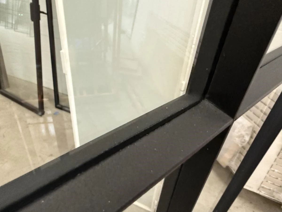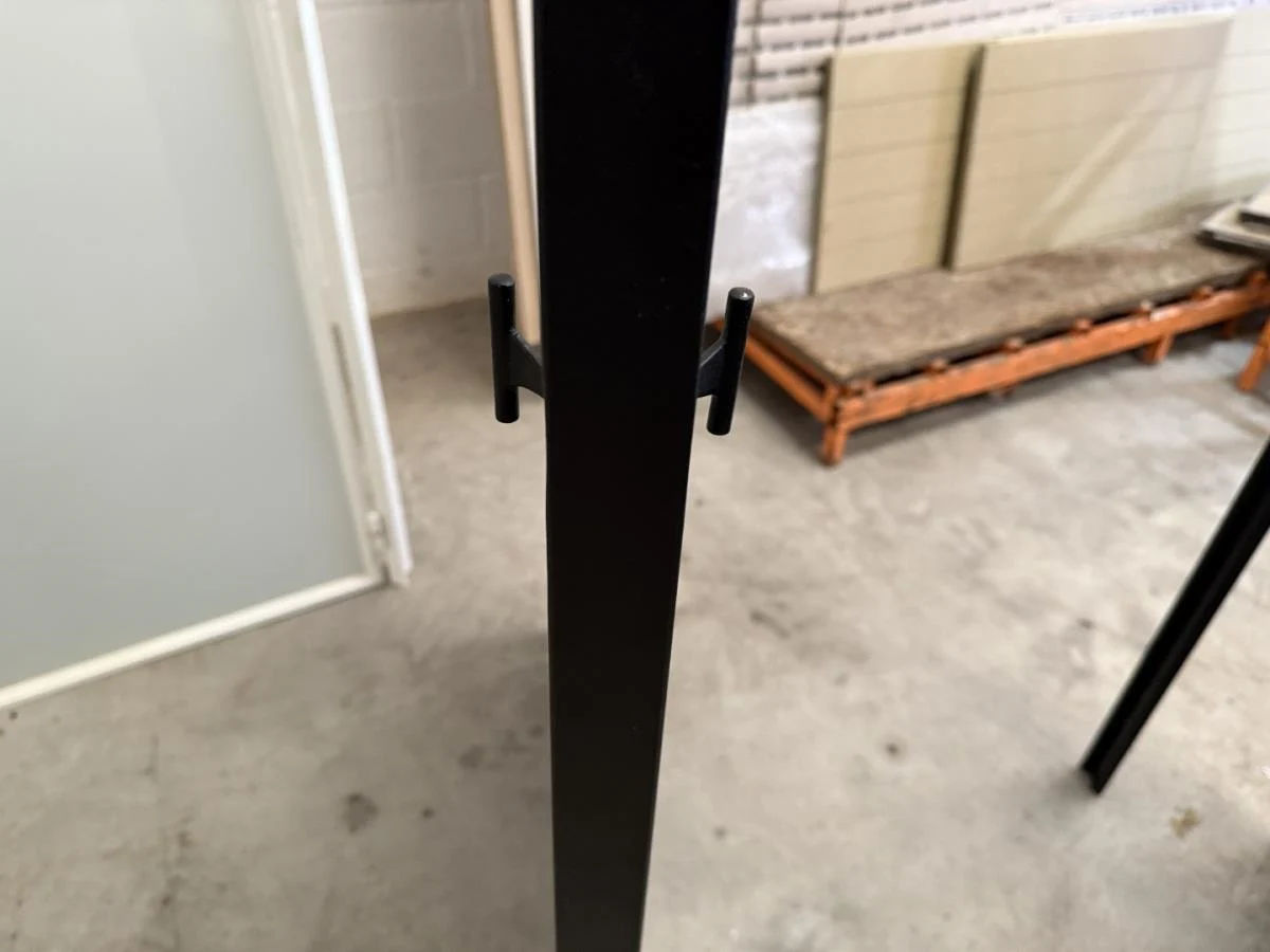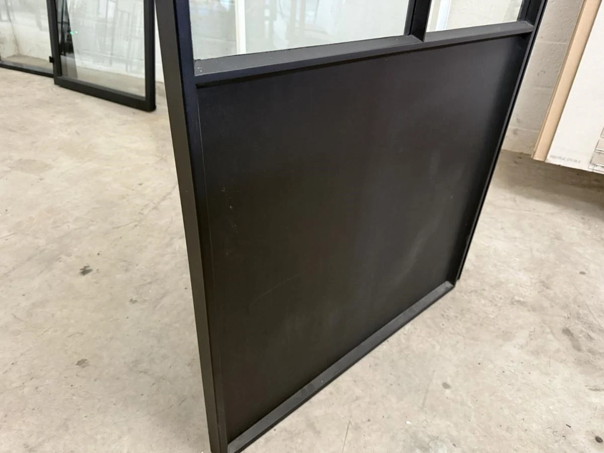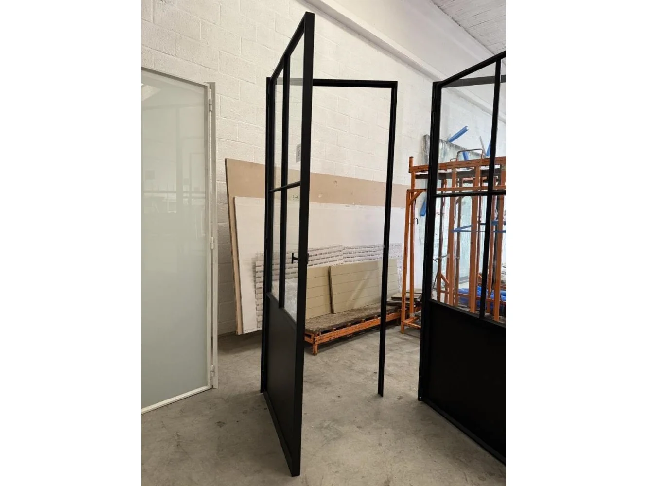 Stalen binnendeur voorzien van 4 onderverdelingen en vast paneel Opgebouwd uit kokerprofielen 40 x 15mm Heldere veiligheidsbeglazing Gezandstraald en gepoederlakt RAL 9005 zwart Artisanaal afgemastikeerd aan 2 zijden HXB:2065x825mm Verkoopprijs 1950€