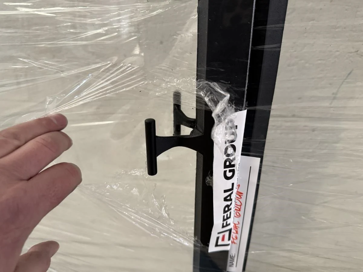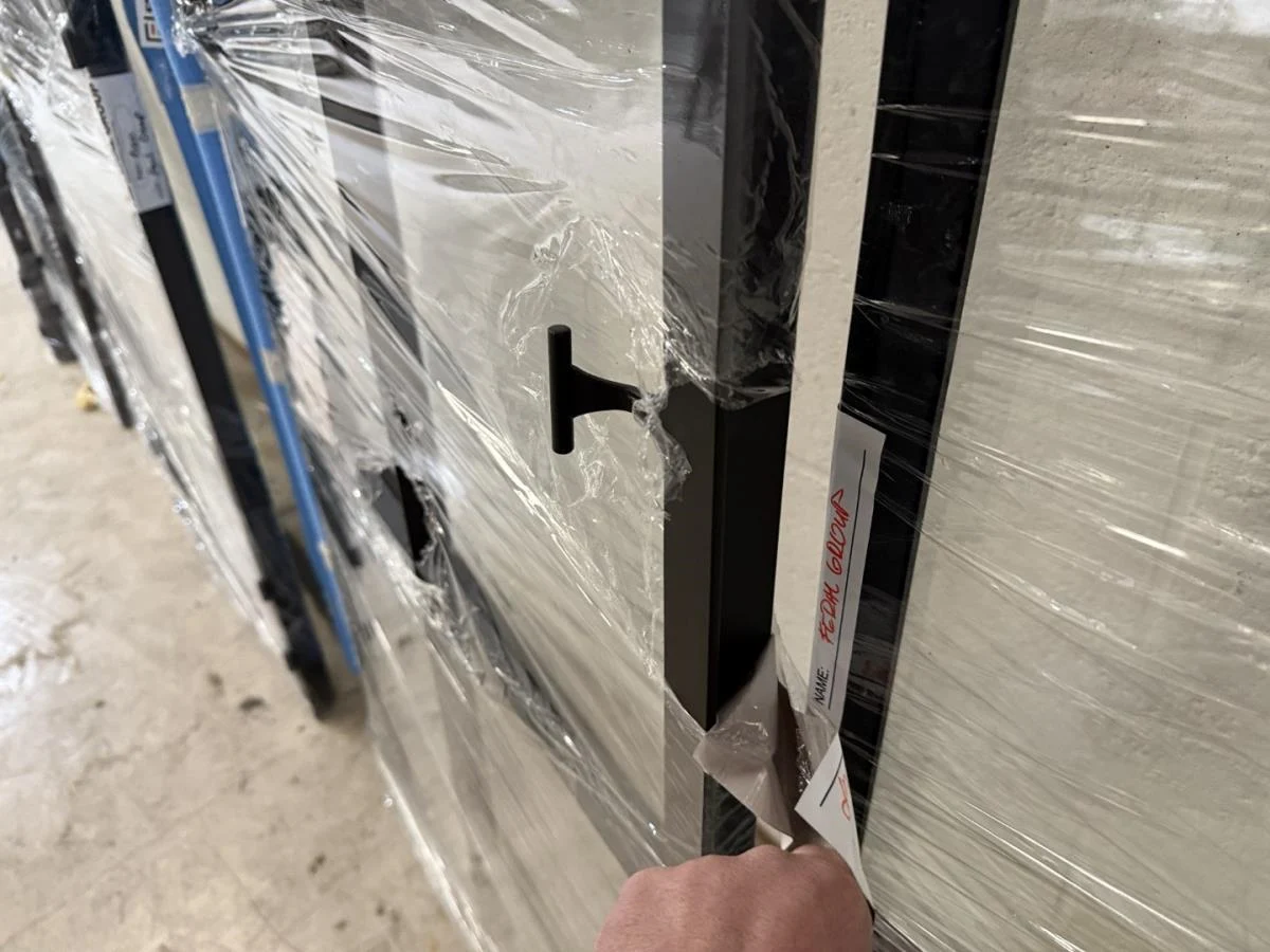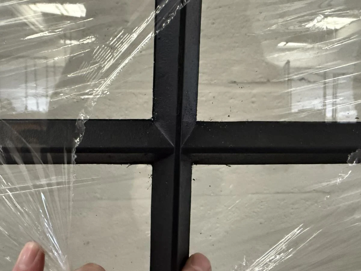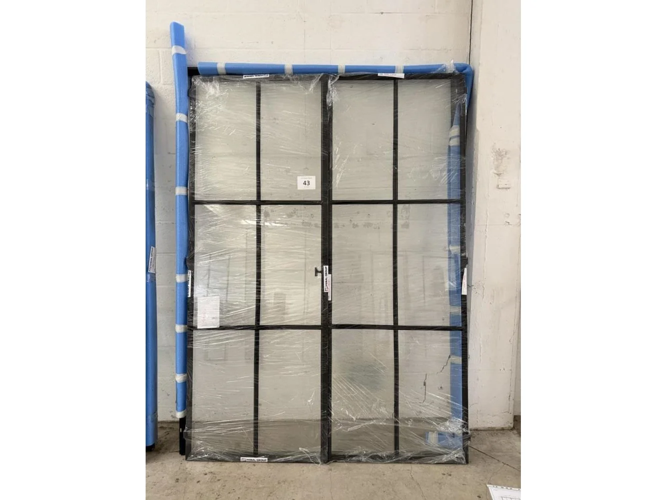Stalen dubbele binnendeur voorzien van 6 onderverdelingen per deur Opgebouwd uit kokerprofielen 40 x 15mm Heldere veiligheidsbeglazing Gezandstraald en gepoederlakt RAL 9005 zwart Artisanaal afgemastikeerd aan 2 zijden HXB:2200x1600mm Verkoopprijs 3000€
