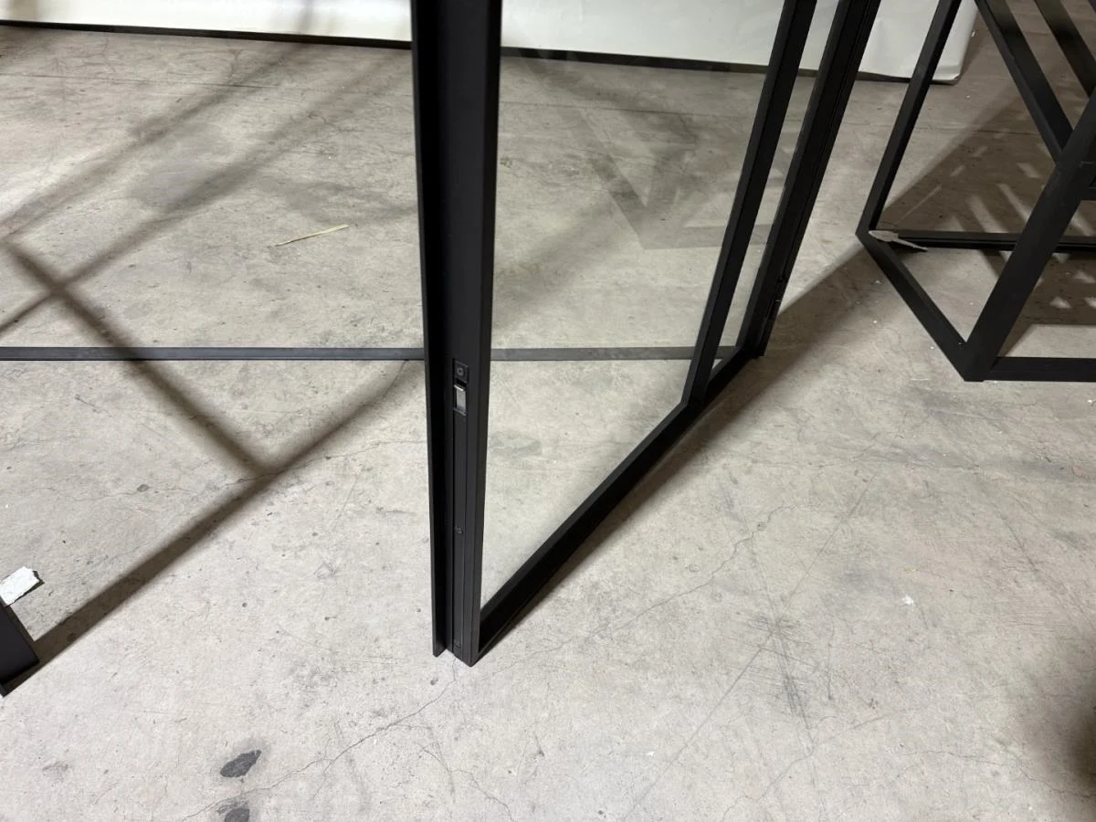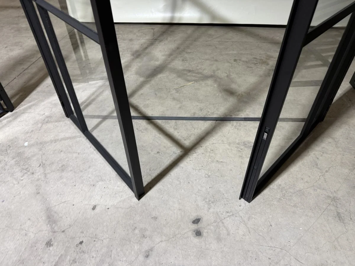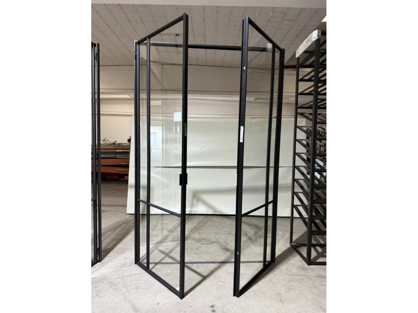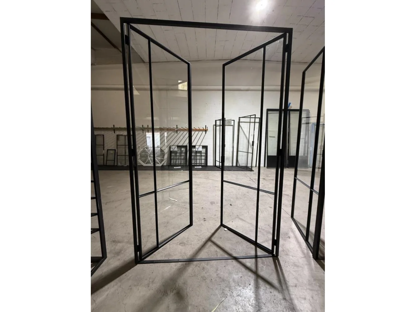 Stalen dubbele binnendeur voorzien van 4 asymmetrische onderverdelingen per deur Opgebouwd uit kokerprofielen 40 x 15mm Heldere veiligheidsbeglazing Gezandstraald en gepoederlakt RAL 9005 zwart Artisanaal afgemastikeerd aan 2 zijden HXB:2400x1600mm Verkoopprijs 3000€