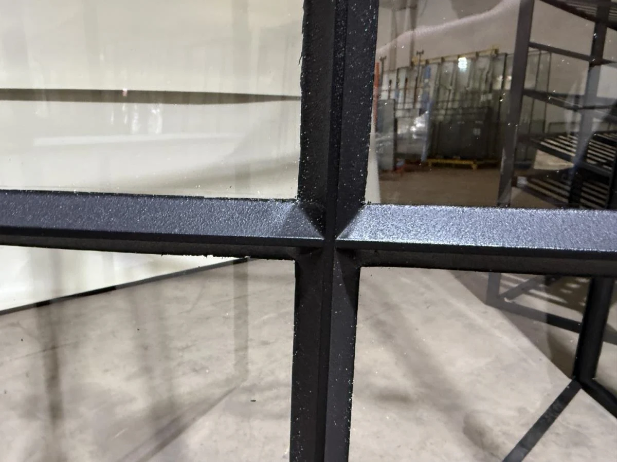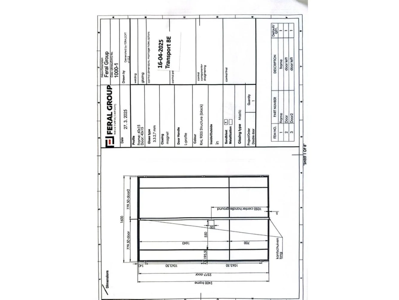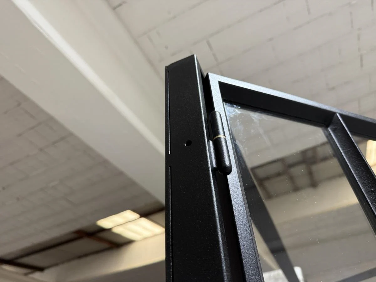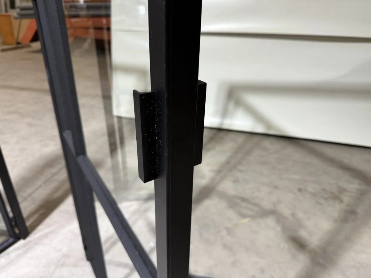 Stalen dubbele binnendeur voorzien van 4 asymmetrische onderverdelingen per deur Opgebouwd uit kokerprofielen 40 x 15mm Heldere veiligheidsbeglazing Gezandstraald en gepoederlakt RAL 9005 zwart Artisanaal afgemastikeerd aan 2 zijden HXB:2400x1600mm Verkoopprijs 3000€