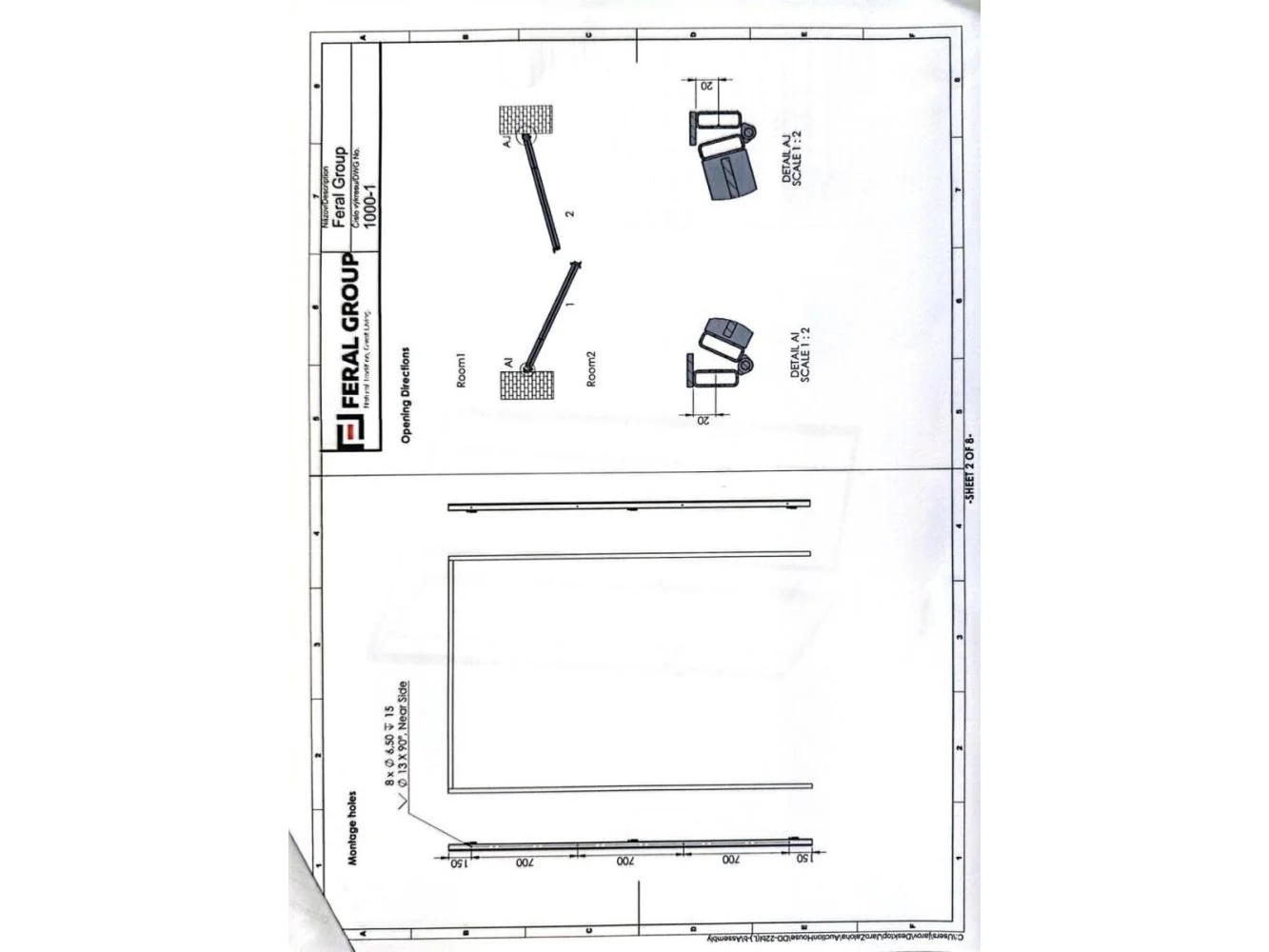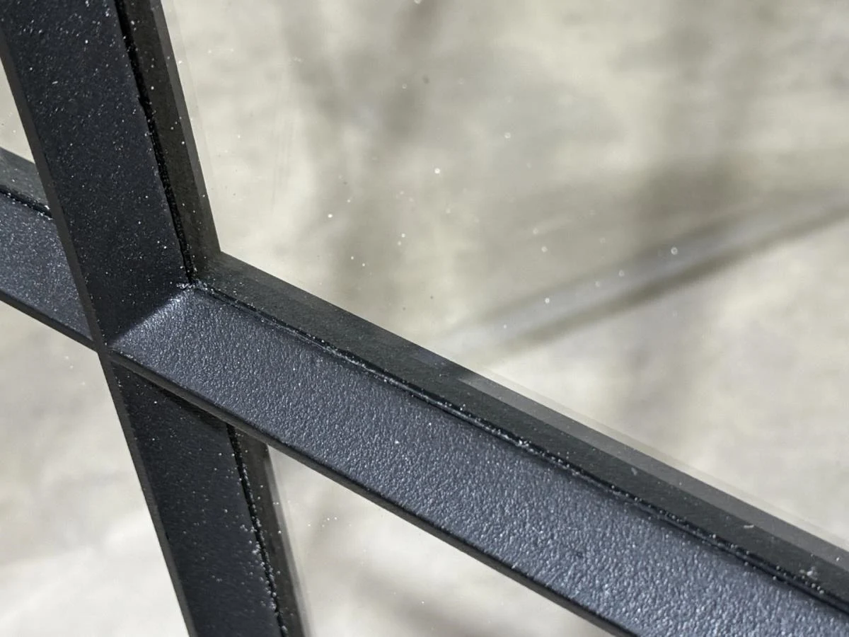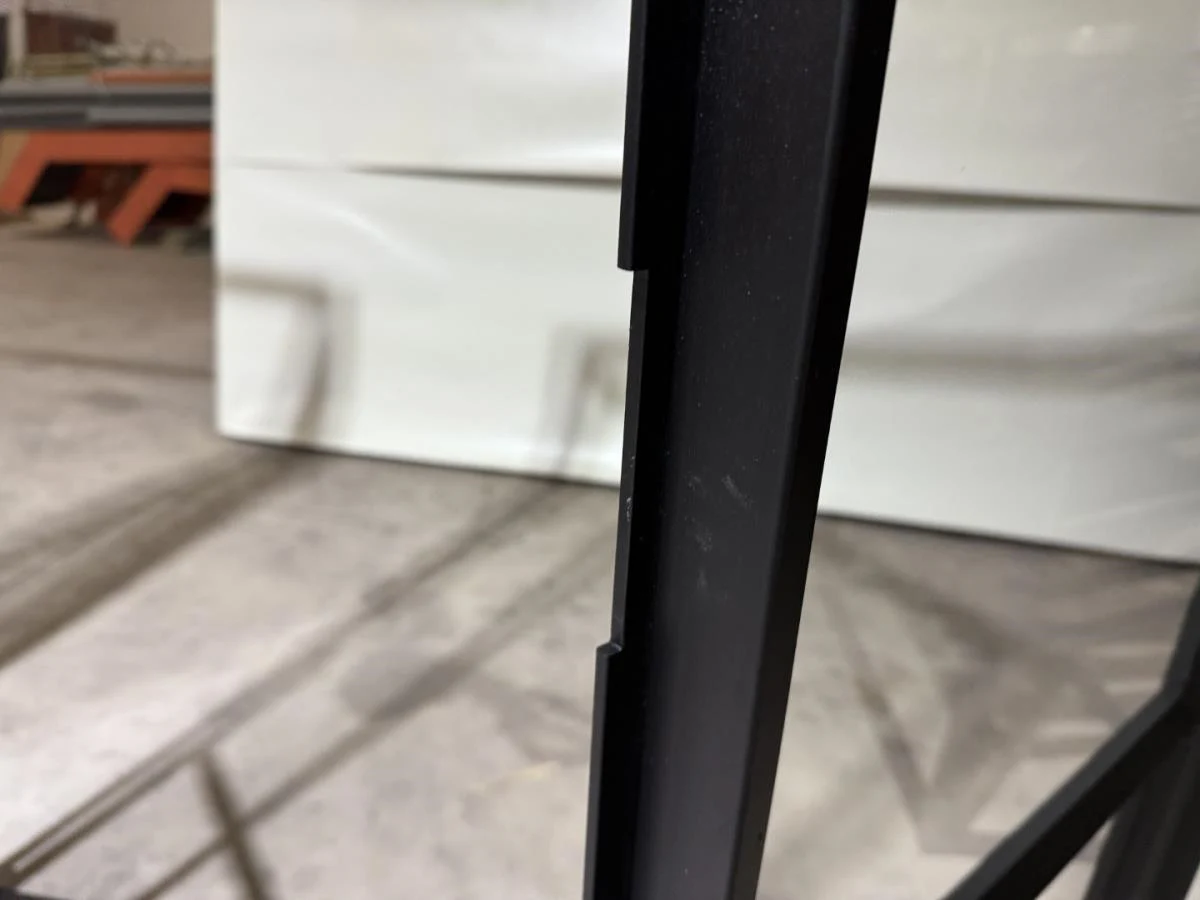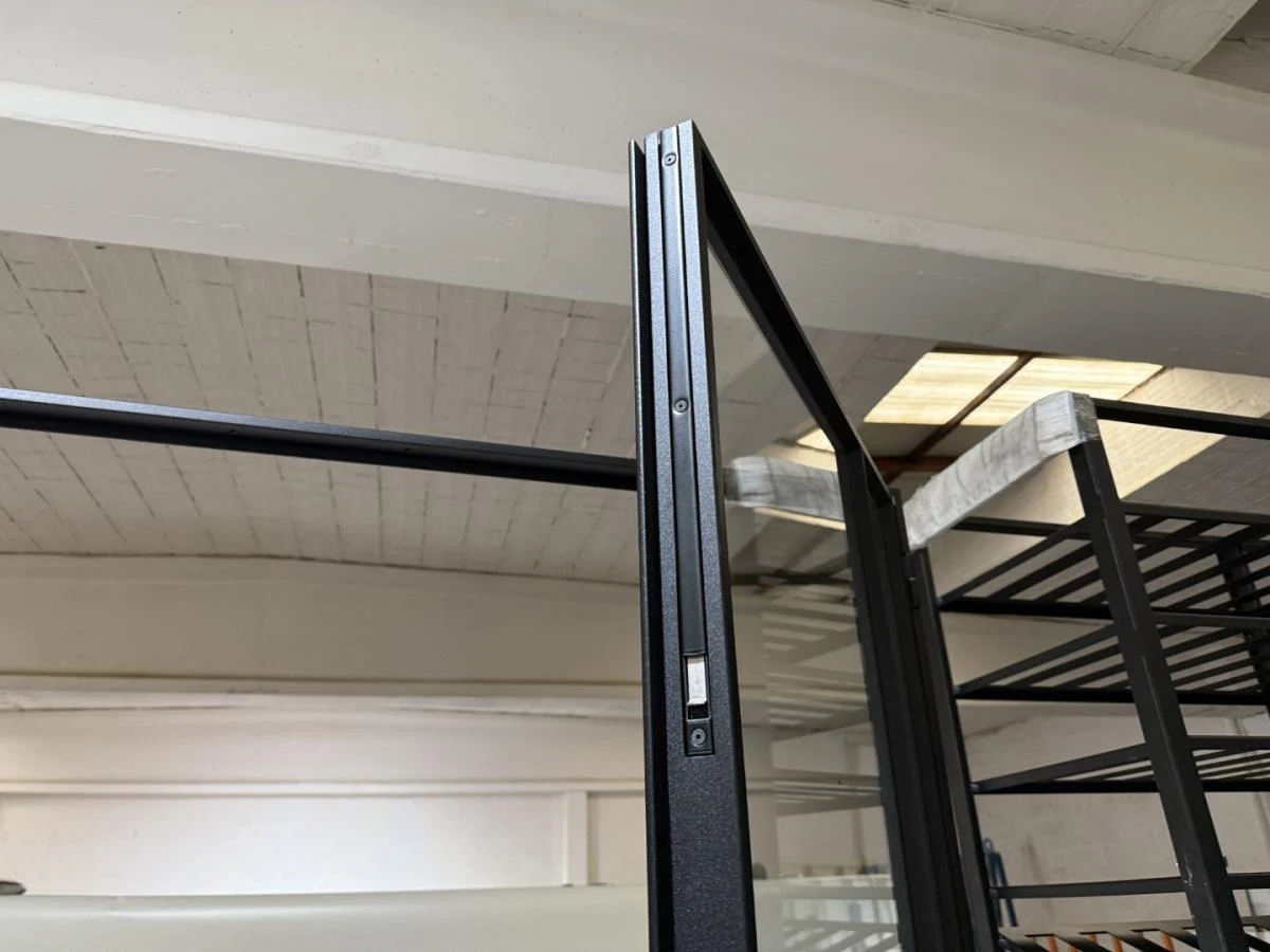 Stalen dubbele binnendeur voorzien van 4 asymmetrische onderverdelingen per deur Opgebouwd uit kokerprofielen 40 x 15mm Heldere veiligheidsbeglazing Gezandstraald en gepoederlakt RAL 9005 zwart Artisanaal afgemastikeerd aan 2 zijden HXB:2400x1600mm Verkoopprijs 3000€