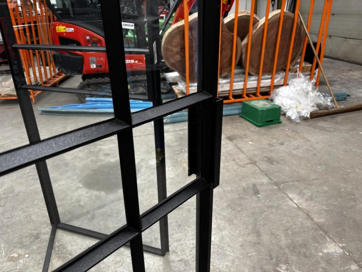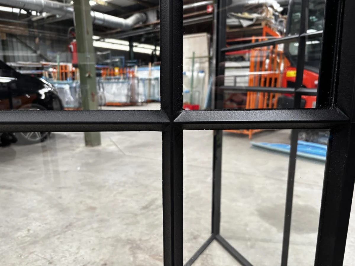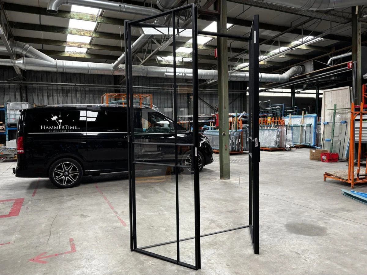 Stalen dubbele binnendeur voorzien van 6 asymmetrische onderverdelingen per deur Opgebouwd uit kokerprofielen 40 x 15mm Heldere veiligheidsbeglazing Gezandstraald en gepoederlakt RAL 9005 zwart Artisanaal afgemastikeerd aan 2 zijden HXB:2400x1600mm Verkoopprijs 3000€