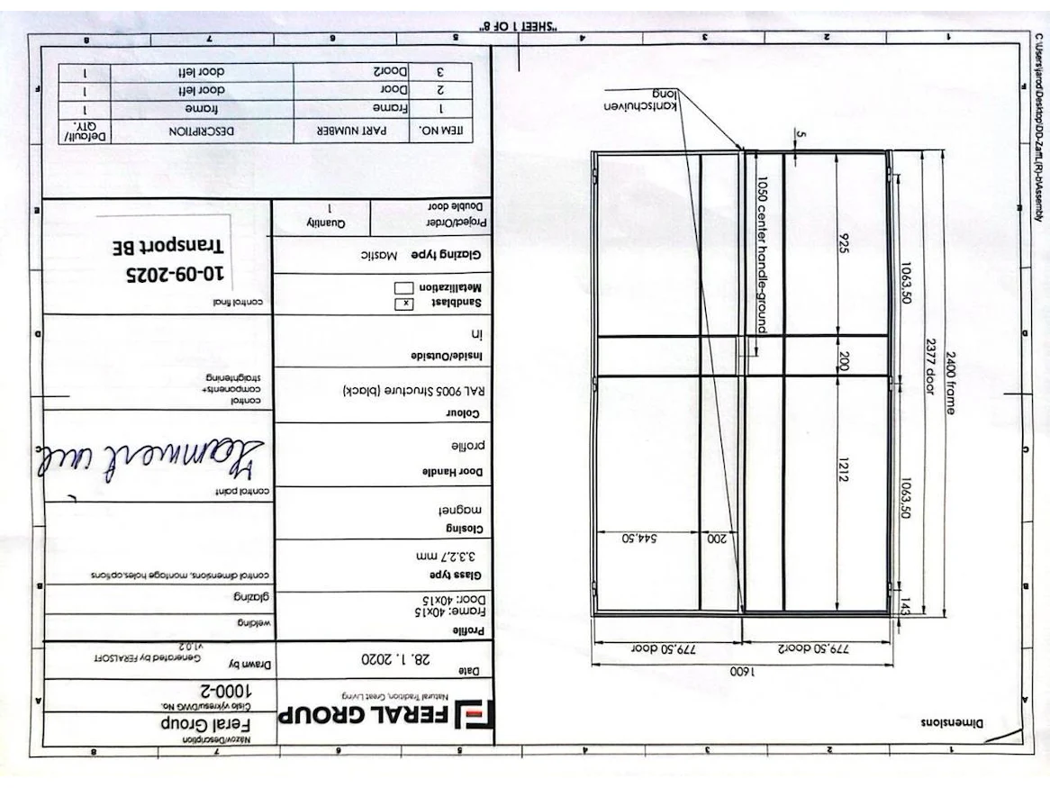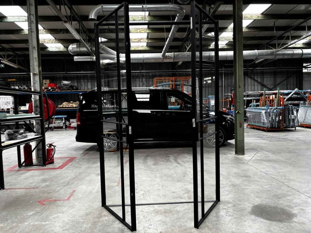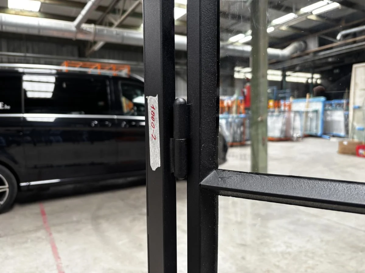 Stalen dubbele binnendeur voorzien van 6 asymmetrische onderverdelingen per deur Opgebouwd uit kokerprofielen 40 x 15mm Heldere veiligheidsbeglazing Gezandstraald en gepoederlakt RAL 9005 zwart Artisanaal afgemastikeerd aan 2 zijden HXB:2400x1600mm Verkoopprijs 3000€