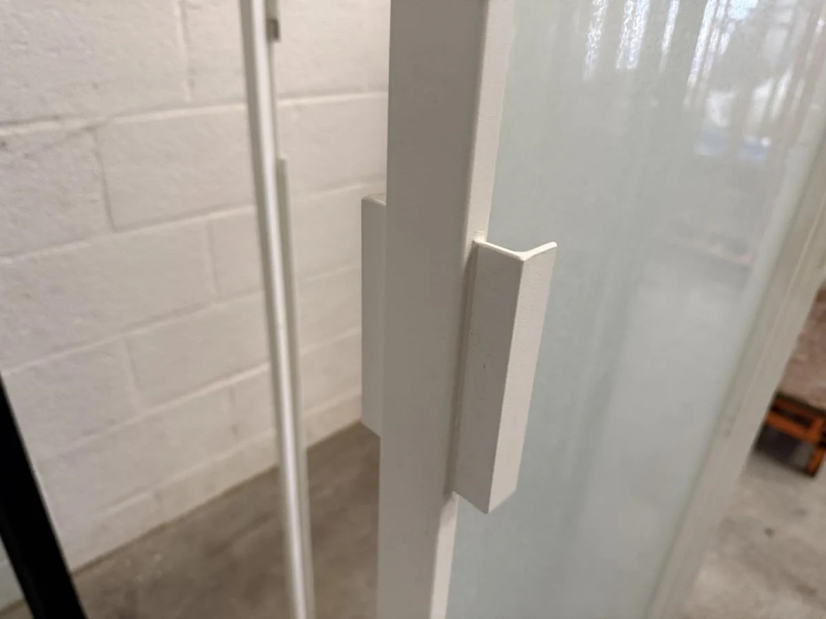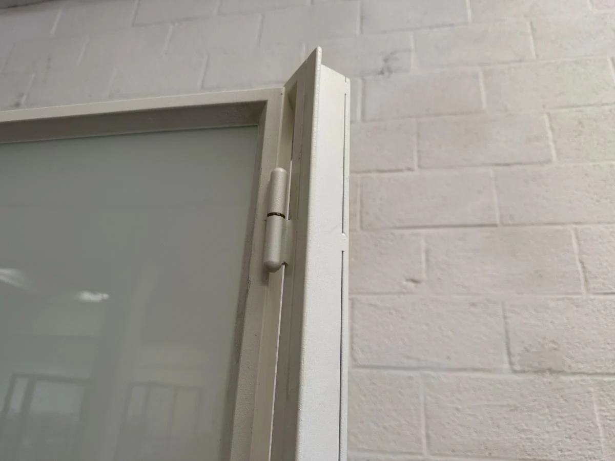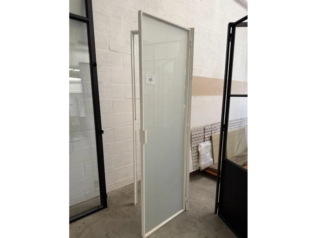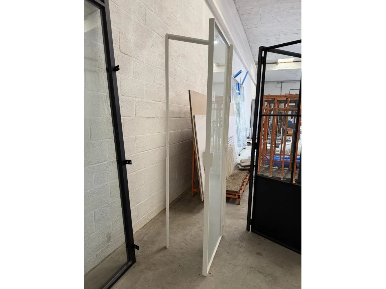 Stalen binnendeur Opgebouwd uit kokerprofielen 40 x 15mm Veiligheidsbeglazing opaal Gezandstraald en gepoederlakt RAL 9010wit Artisanaal afgemastikeerd aan 2 zijden HXB:2040x650mm Verkoopprijs 1950€
