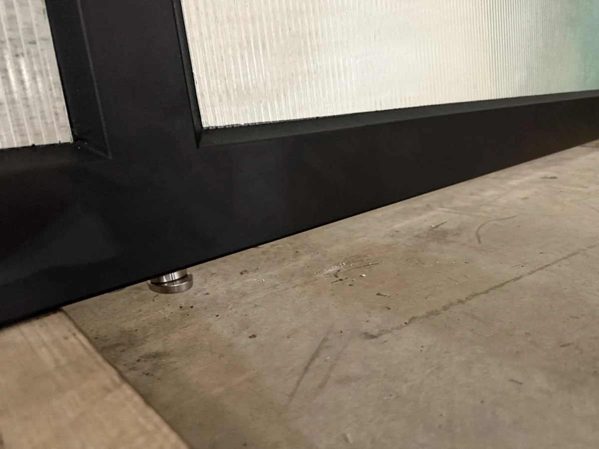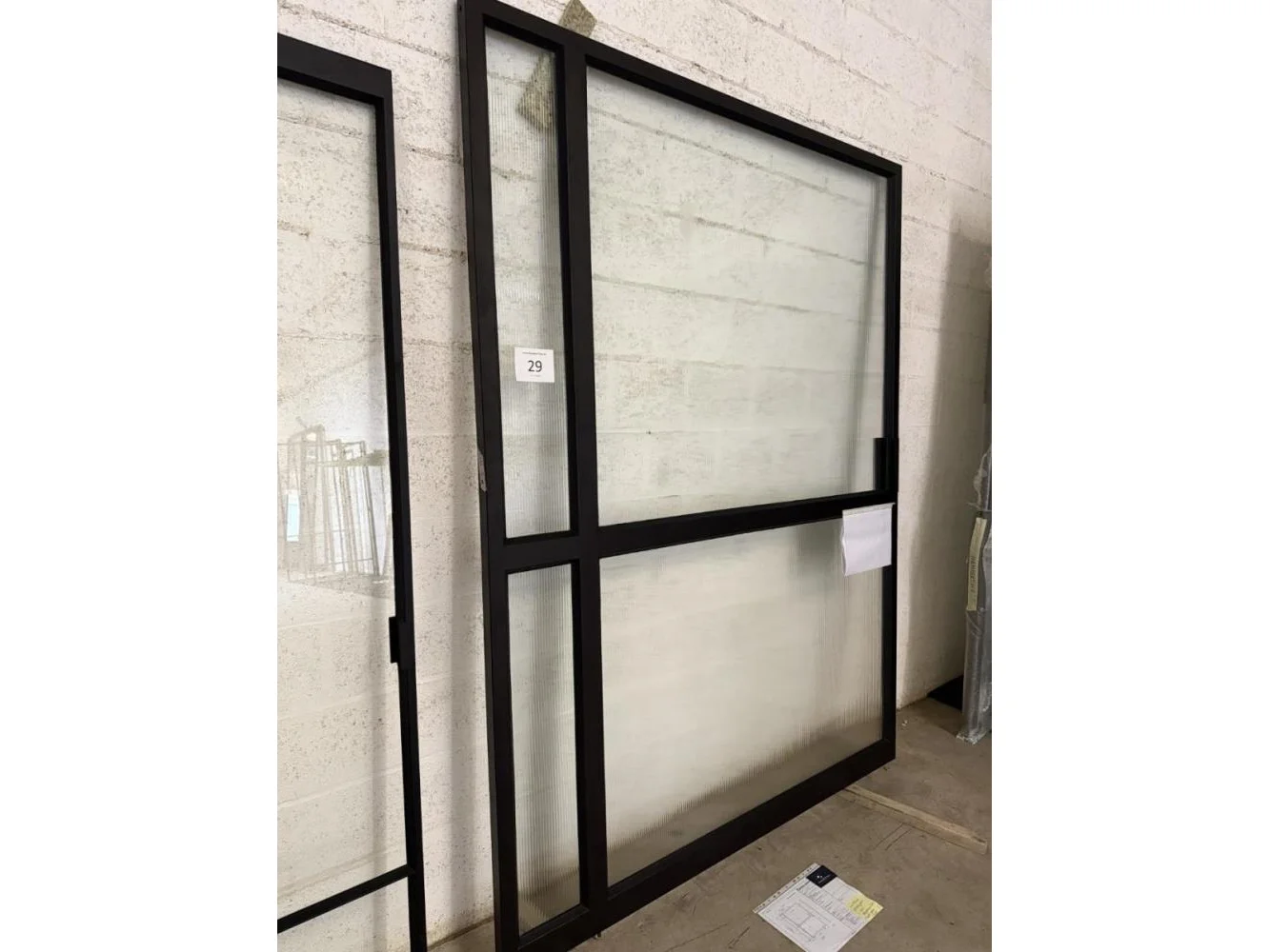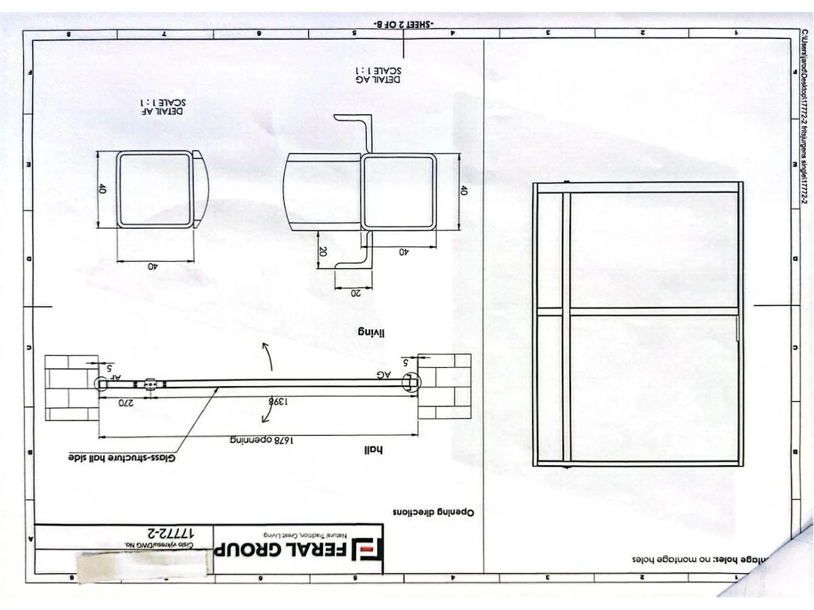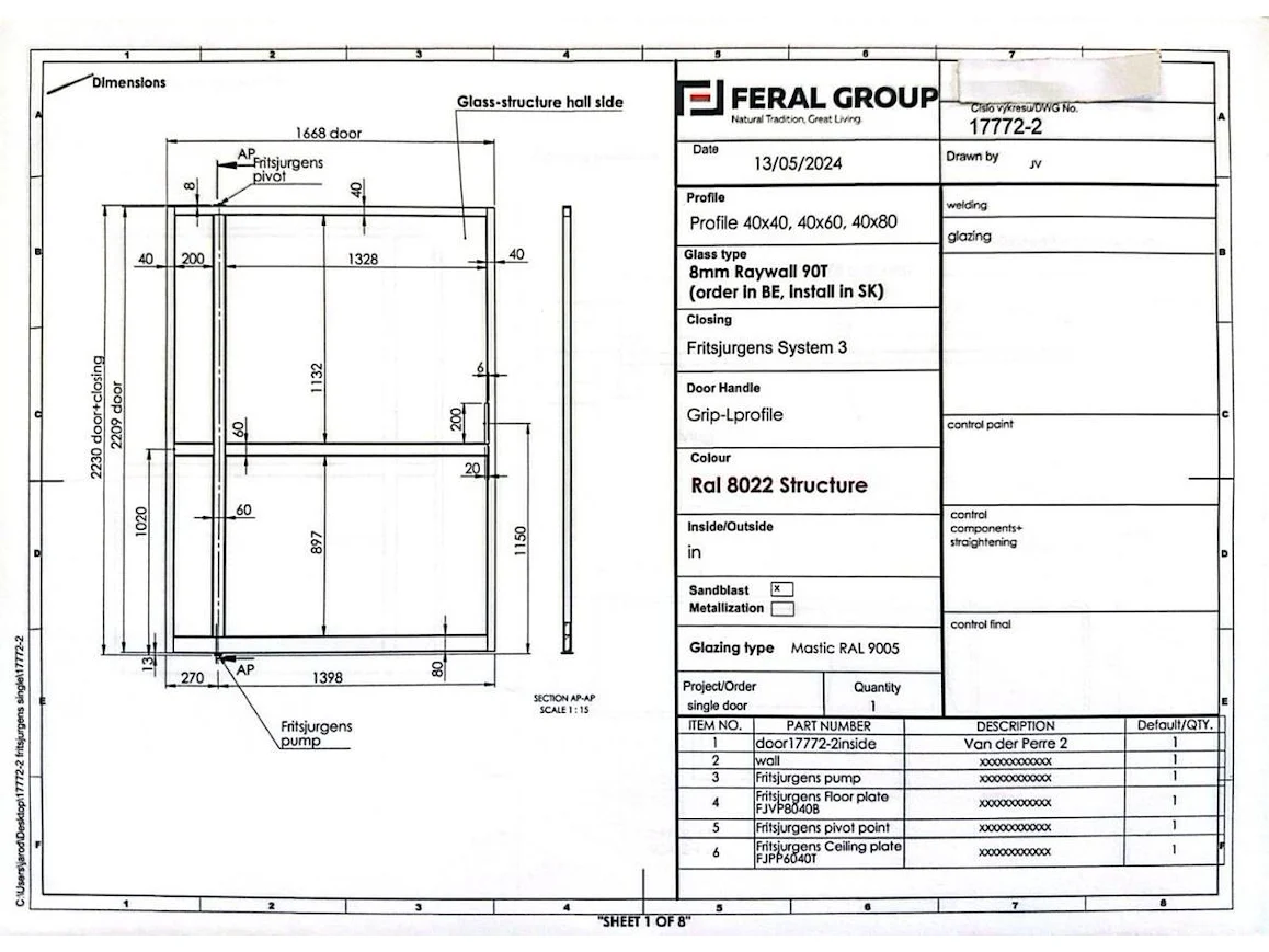 Stalen pivoterende binnendeur opgebouwd uit kokerprofielen zie technische fiche. Speciale beglazing RAYWALL. Uniek stuk. Afmeting deur B 2230 x H 1668. Gepoederlakt in RAL 8022 zwartbruin. Afgemastikeerd in zwart RAL 9005. Pompsysteem Fritsjurgens niet inbegrepen. Verkoopprijs 4500€