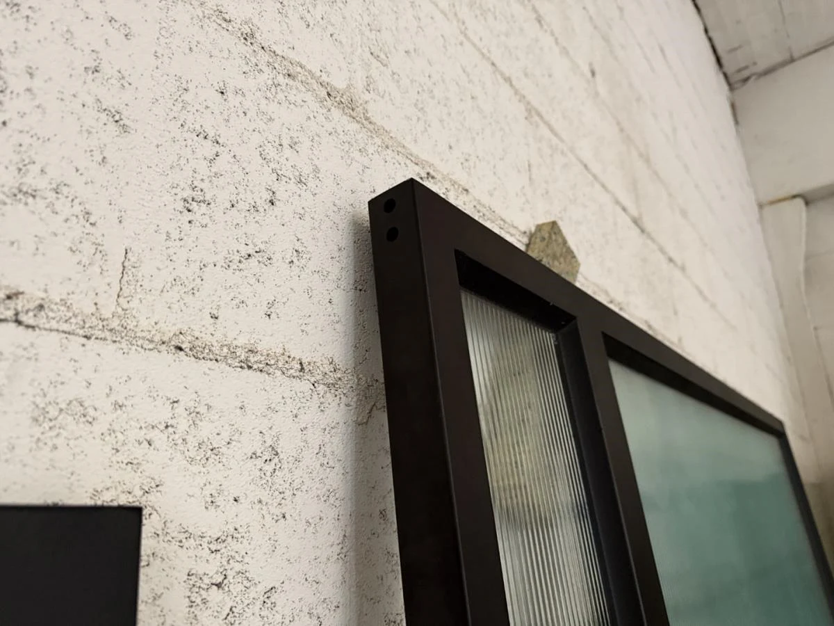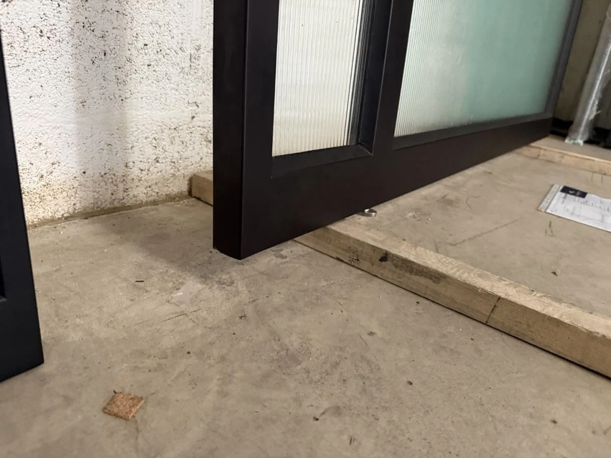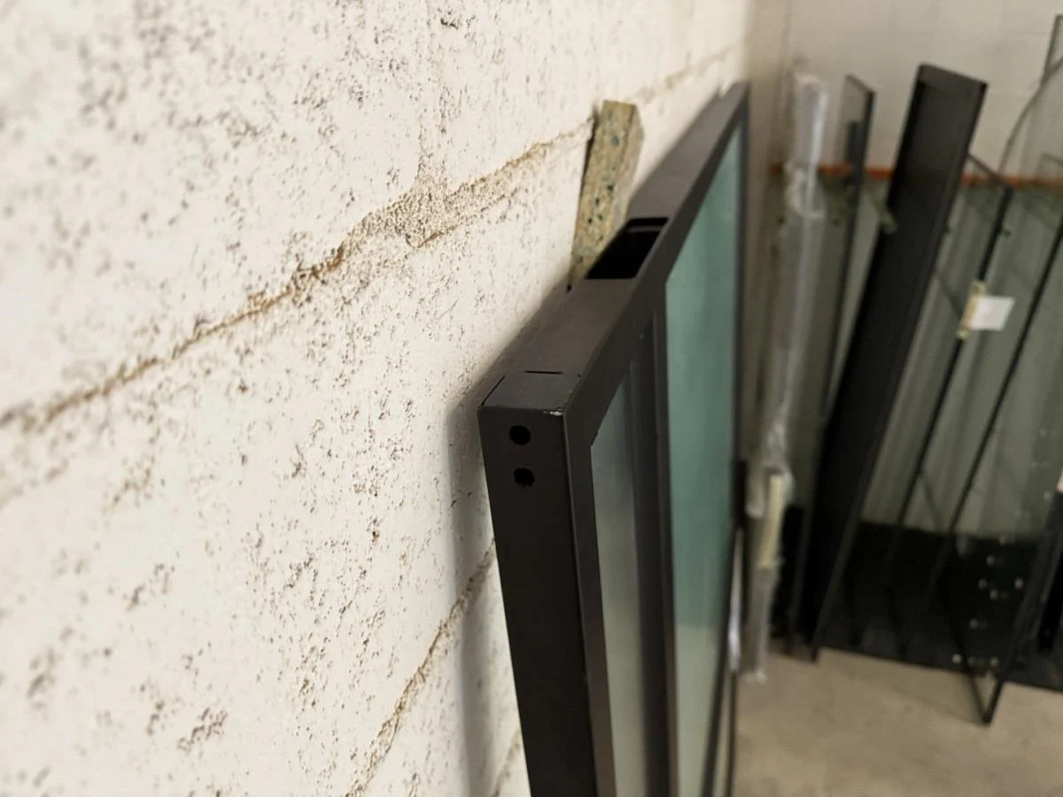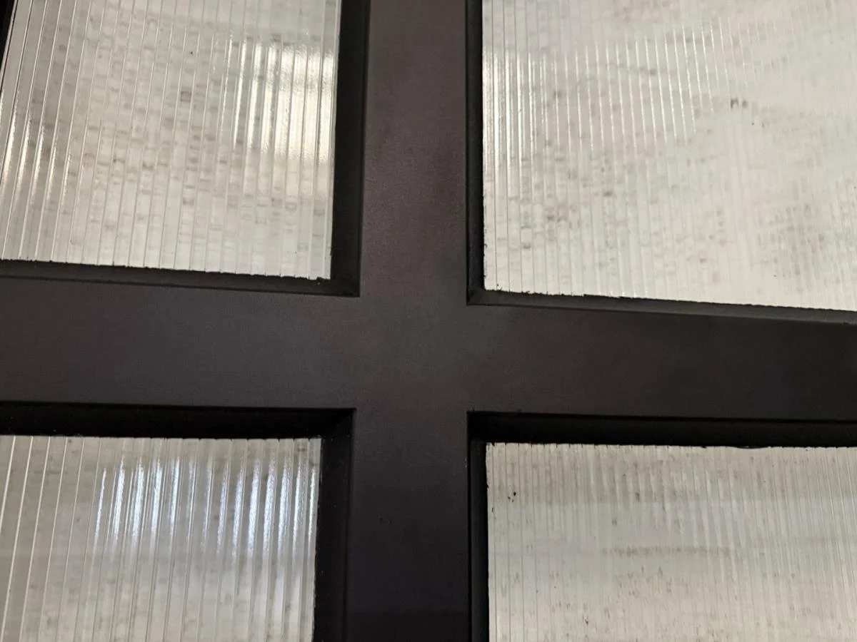 Stalen pivoterende binnendeur opgebouwd uit kokerprofielen zie technische fiche. Speciale beglazing RAYWALL. Uniek stuk. Afmeting deur B 2230 x H 1668. Gepoederlakt in RAL 8022 zwartbruin. Afgemastikeerd in zwart RAL 9005. Pompsysteem Fritsjurgens niet inbegrepen. Verkoopprijs 4500€
