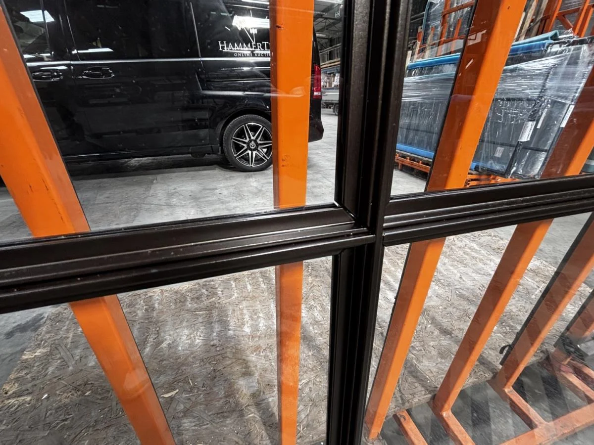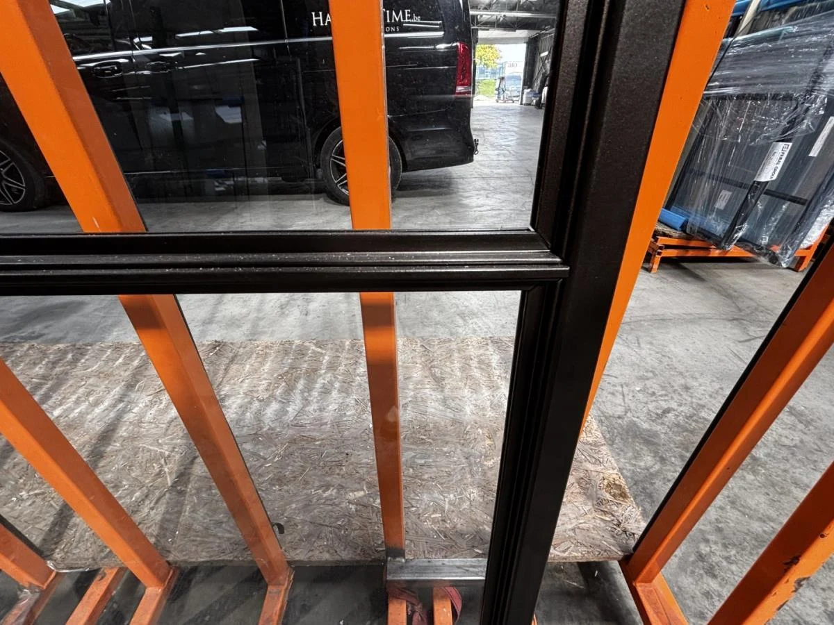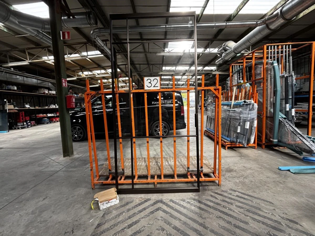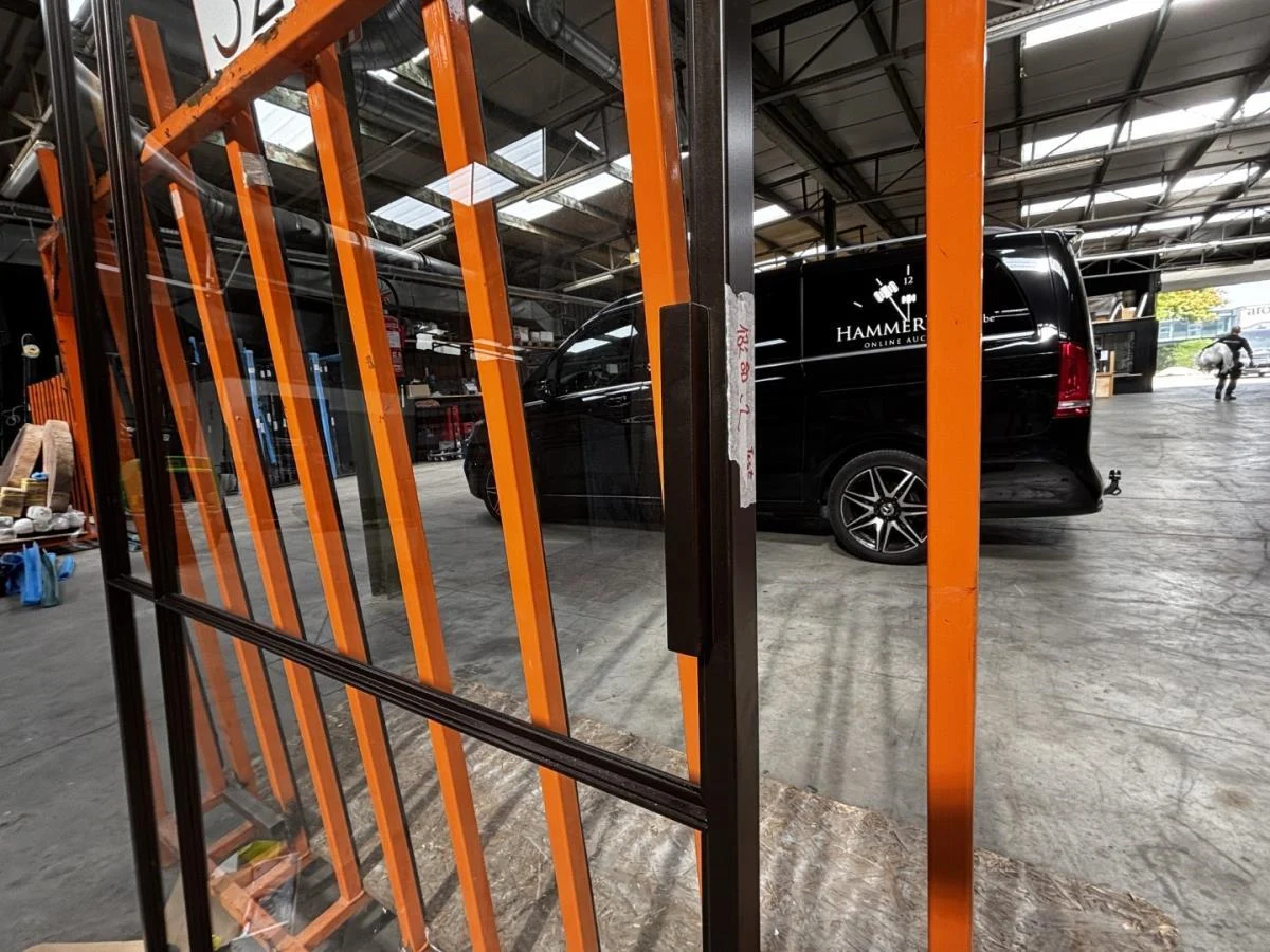 Stalen pivoterende binnendeur opgebouwd uit kokerprofielen zie technische fiche. Heldere veiligheidsbeglazing. Afmeting deur B 1228 x H 2603. Gepoederlakt in RAL 9005 zwart. Afgemastikeerd in zwart RAL 9005. Pompsysteem inbegrepen. Verkoopprijs 2750€