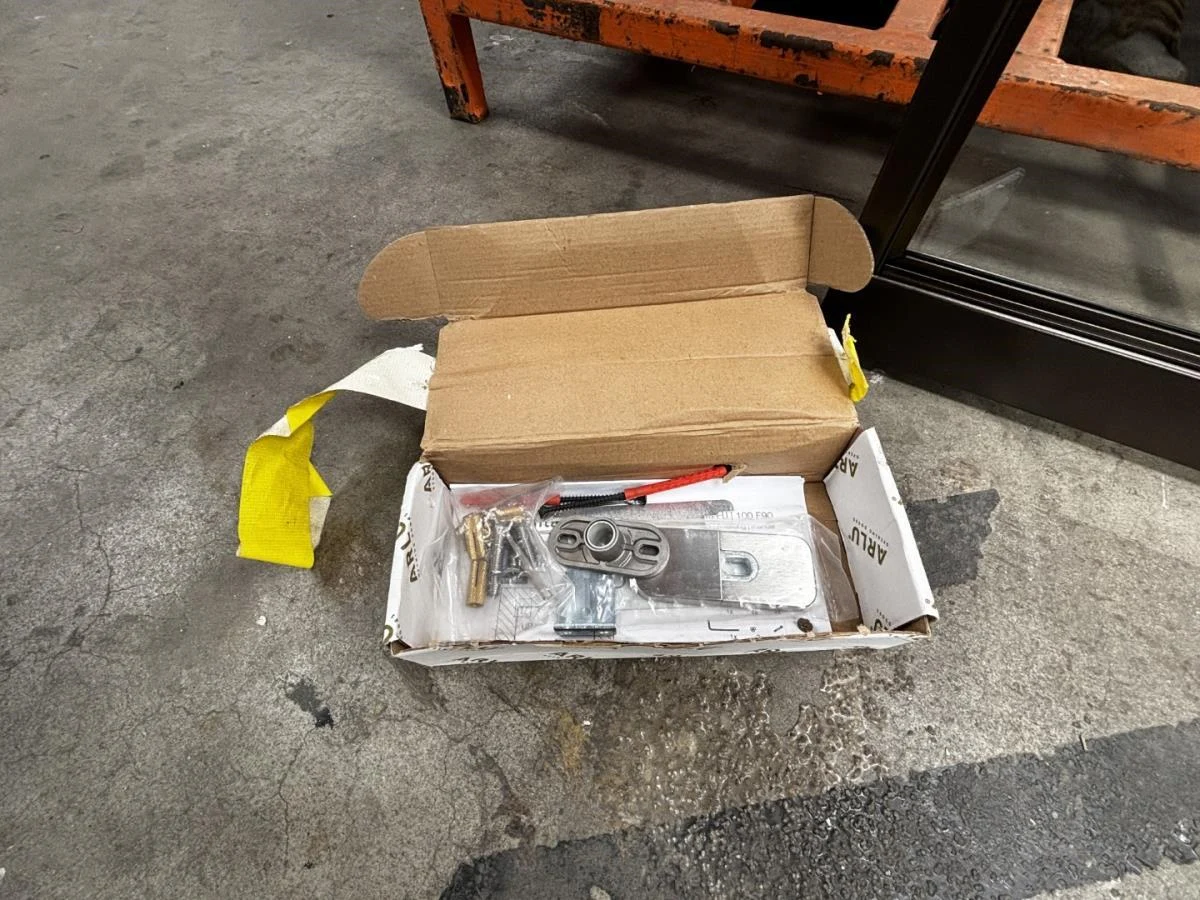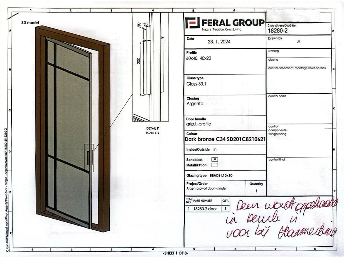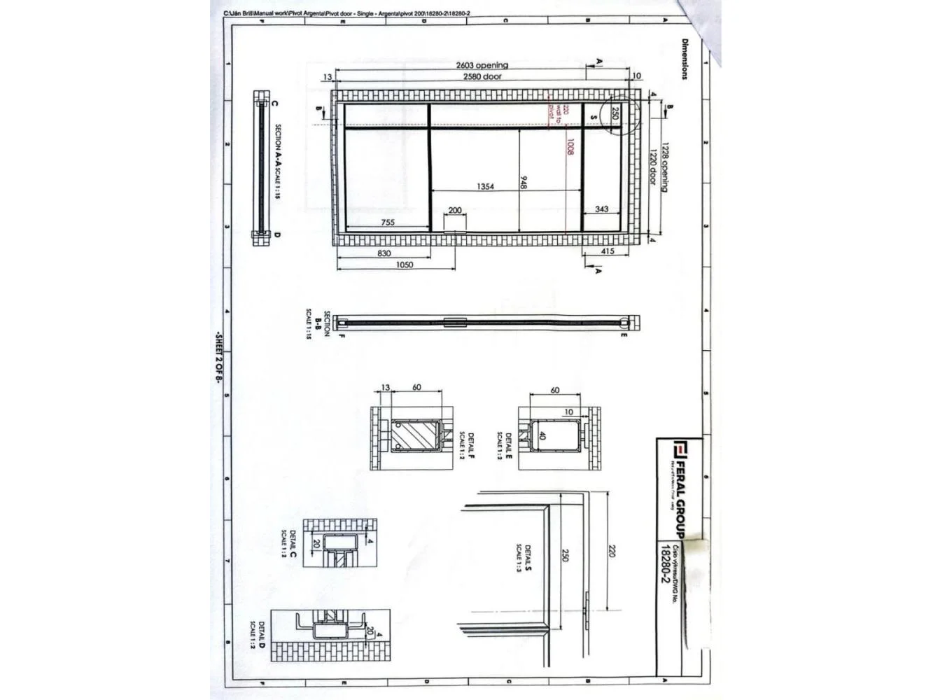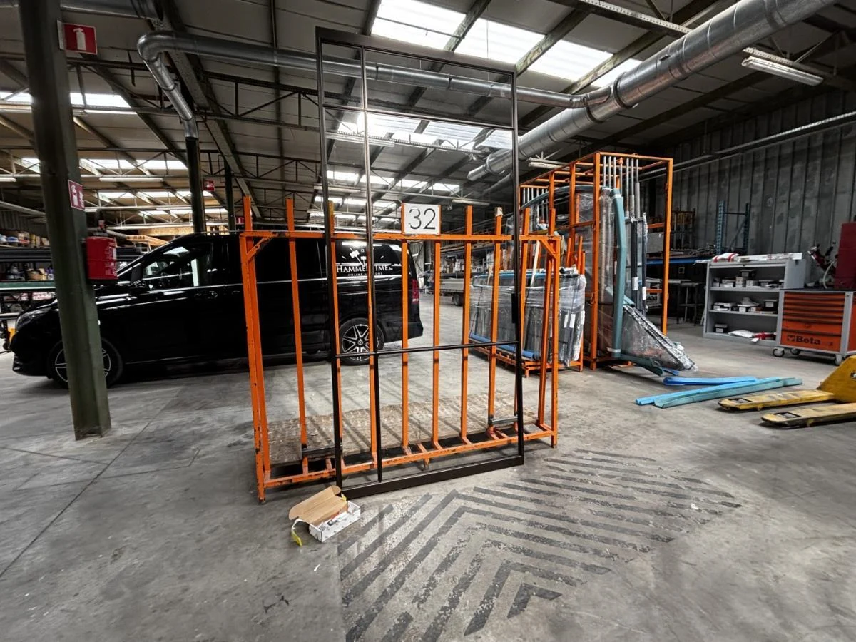 Stalen pivoterende binnendeur opgebouwd uit kokerprofielen zie technische fiche. Heldere veiligheidsbeglazing. Afmeting deur B 1228 x H 2603. Gepoederlakt in RAL 9005 zwart. Afgemastikeerd in zwart RAL 9005. Pompsysteem inbegrepen. Verkoopprijs 2750€