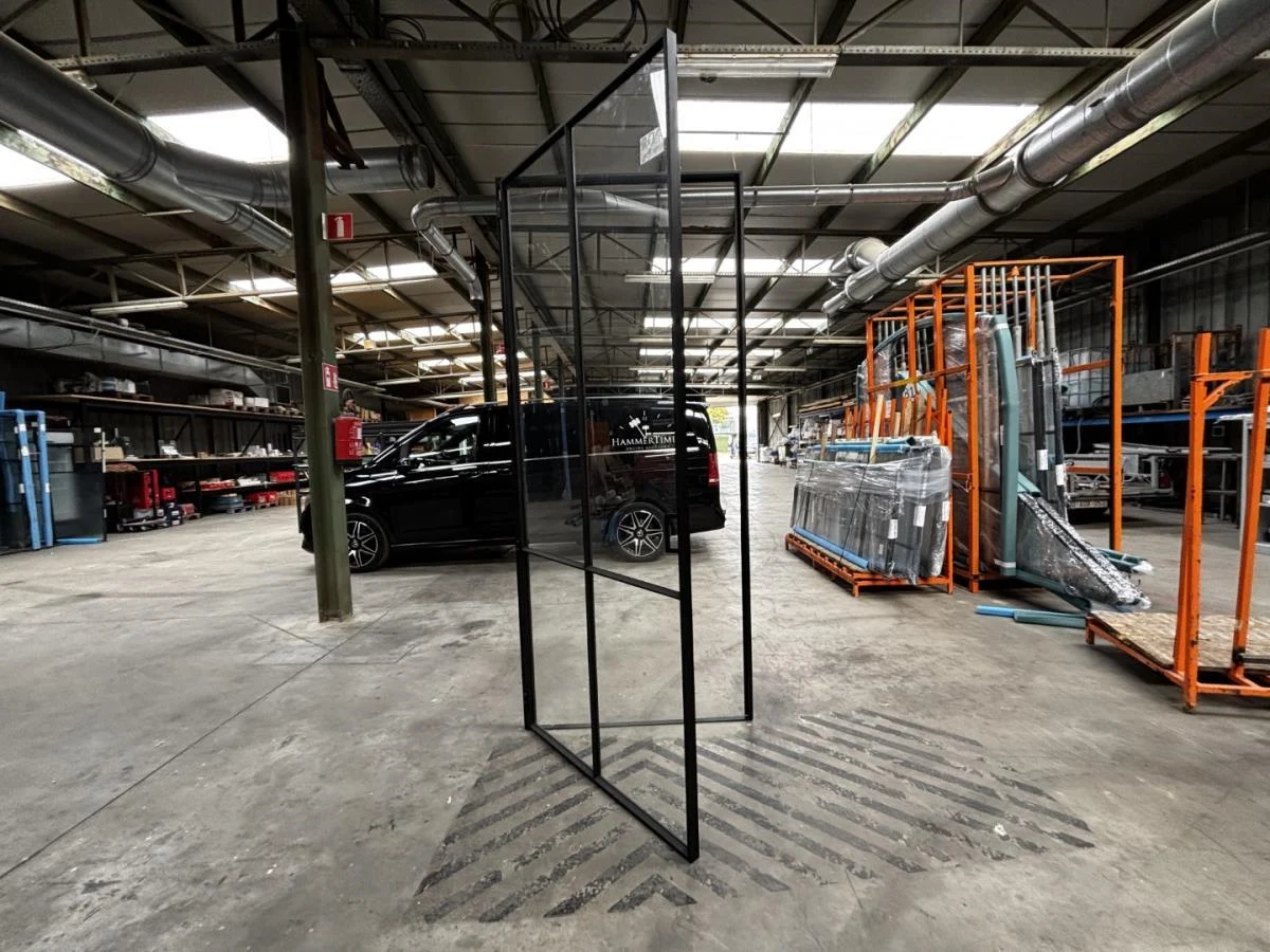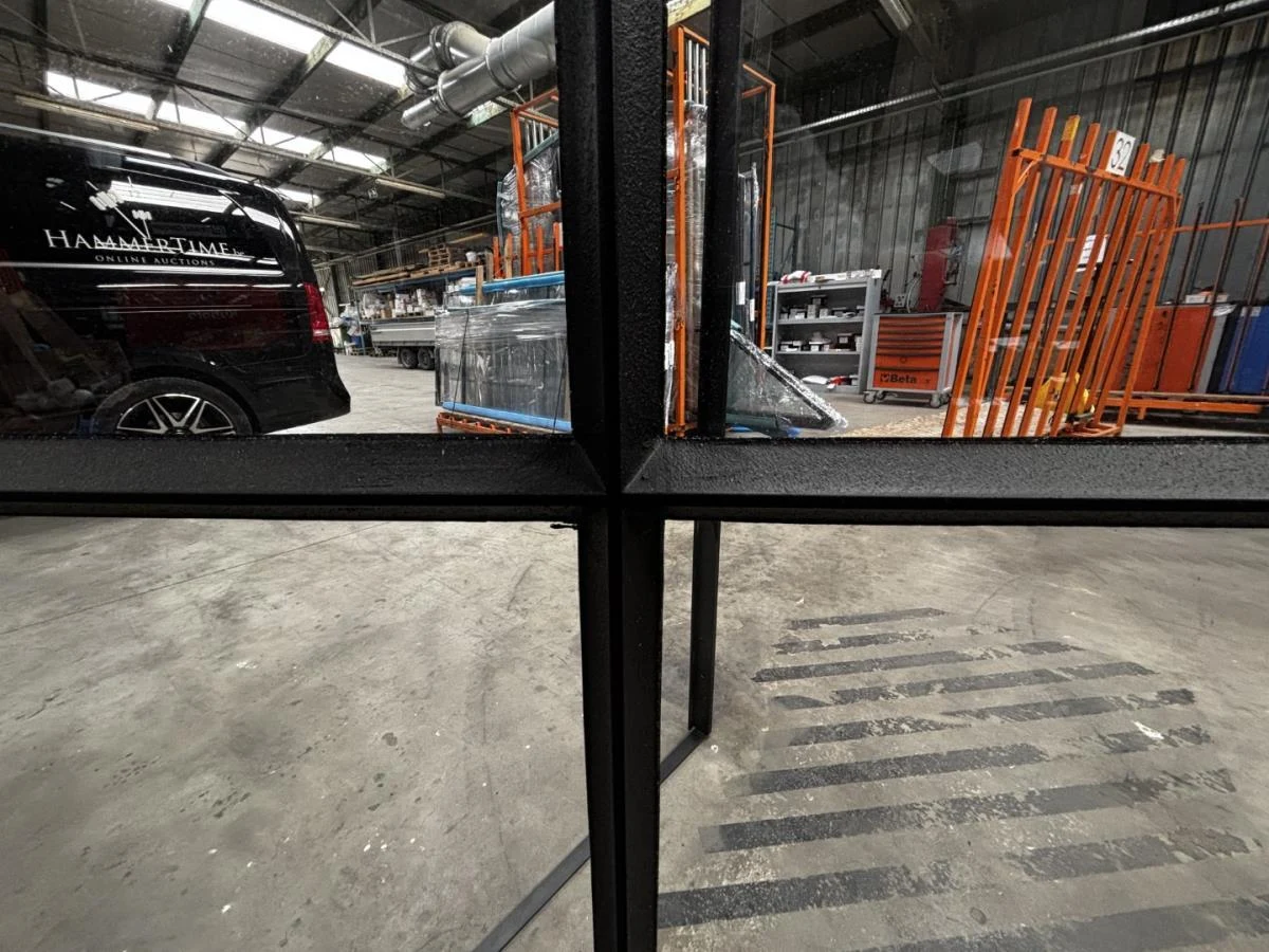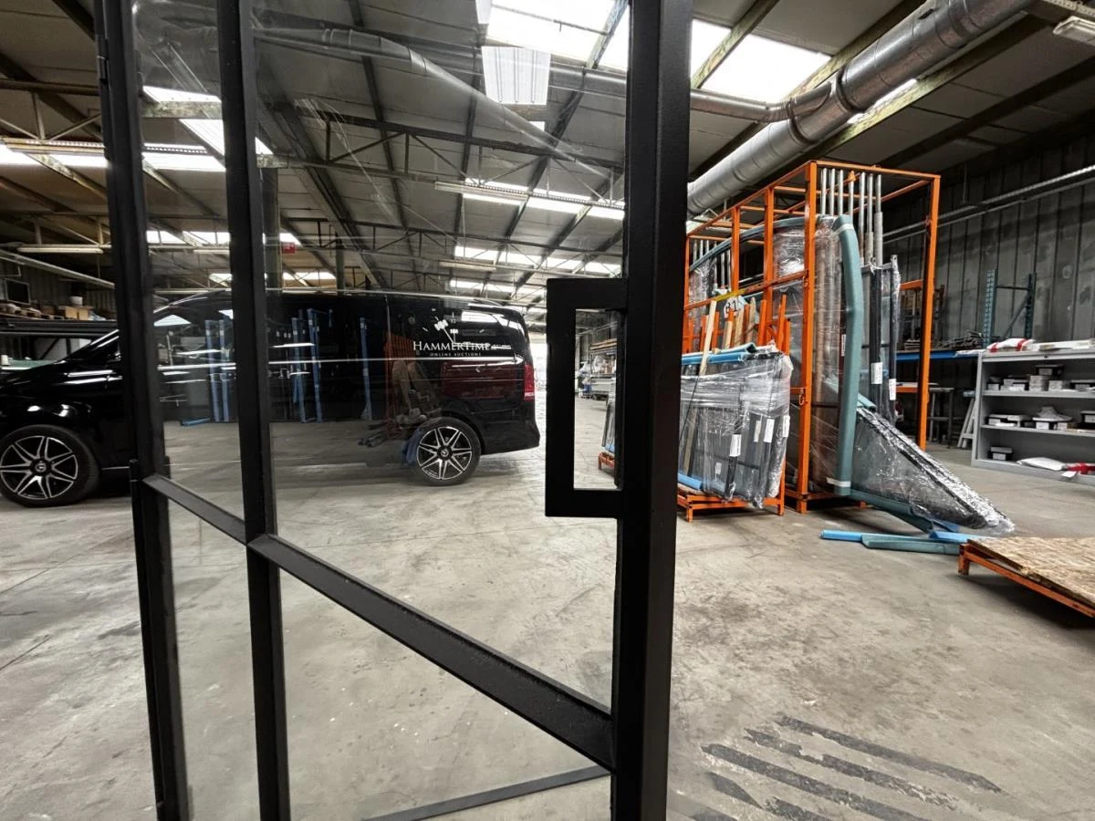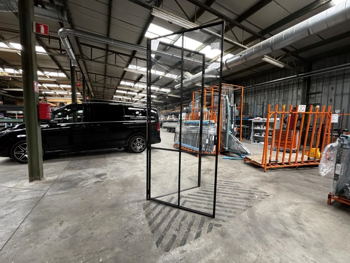 Stalen binnendeur, 4 onderverdelingen. Opgebouwd uit kokerprofielen 40 x 15mm. Heldere veiligheidsbeglazing. Afmeting H2485 x B1072. Gepoederlakt in Ral 9005 zwart, afgemastikeerd aan beide zijden. Verkoopprijs 2250€