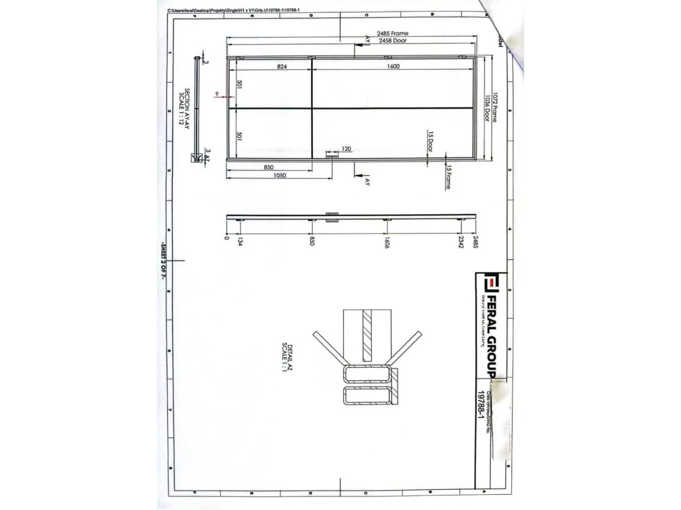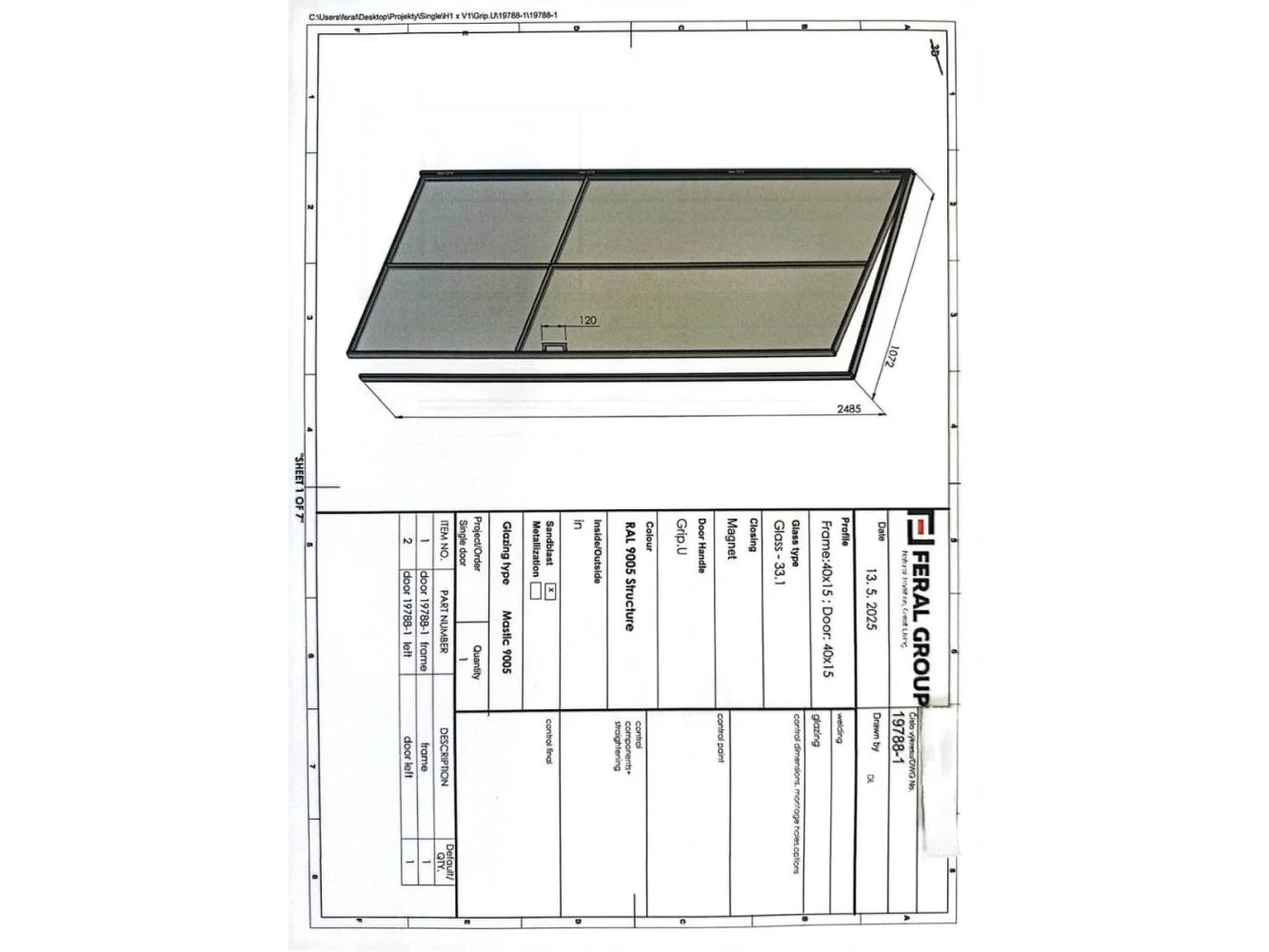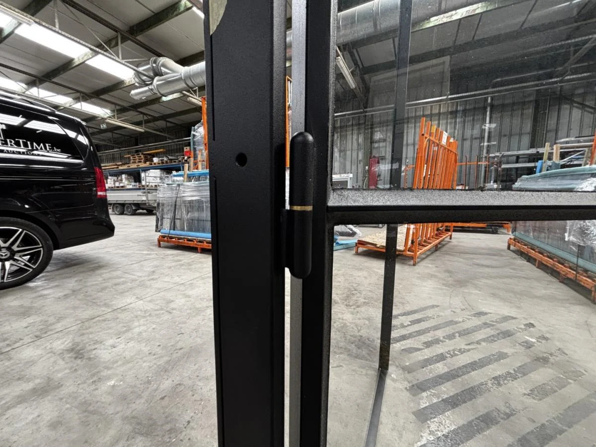 Stalen binnendeur, 4 onderverdelingen. Opgebouwd uit kokerprofielen 40 x 15mm. Heldere veiligheidsbeglazing. Afmeting H2485 x B1072. Gepoederlakt in Ral 9005 zwart, afgemastikeerd aan beide zijden. Verkoopprijs 2250€