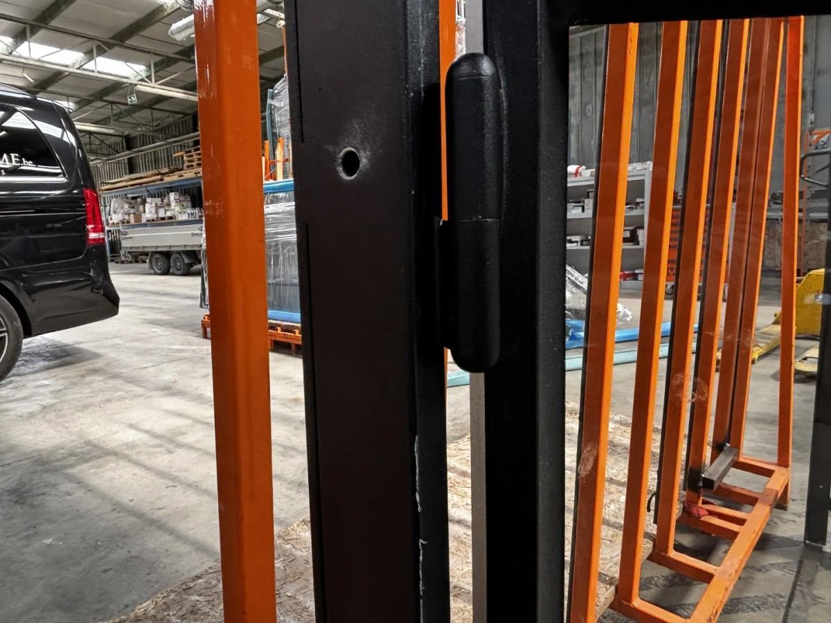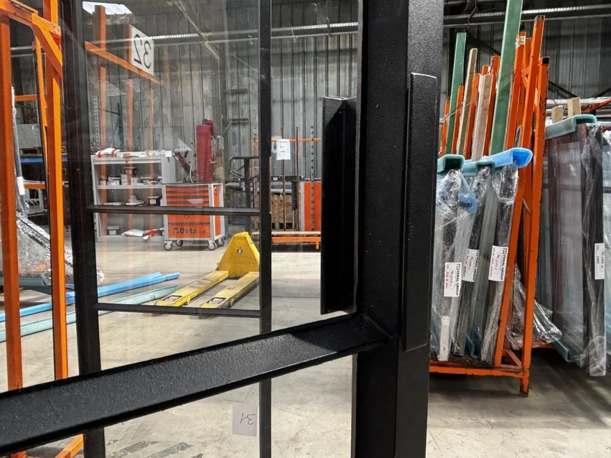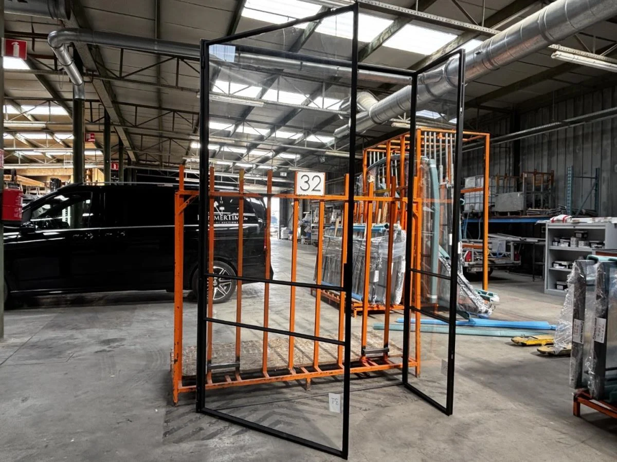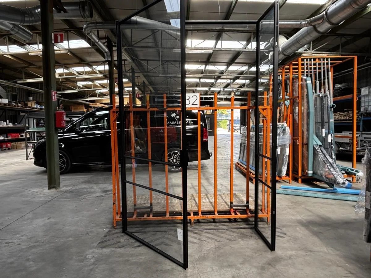 Stalen dubbele binnendeur voorzien van 3 onderverdelingen per deur Opgebouwd uit kokerprofielen 40 x 15mm Heldere veiligheidsbeglazing Gezandstraald en gepoederlakt RAL 9005 zwart Artisanaal afgemastikeerd aan 2 zijden HXB:2286x1670mm Verkoopprijs 3000€