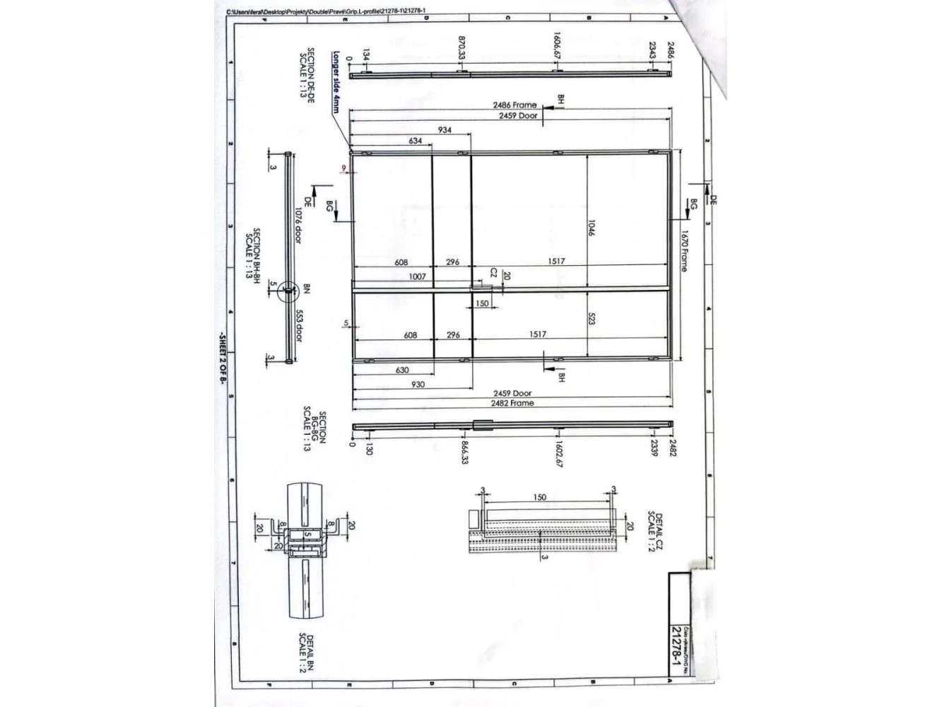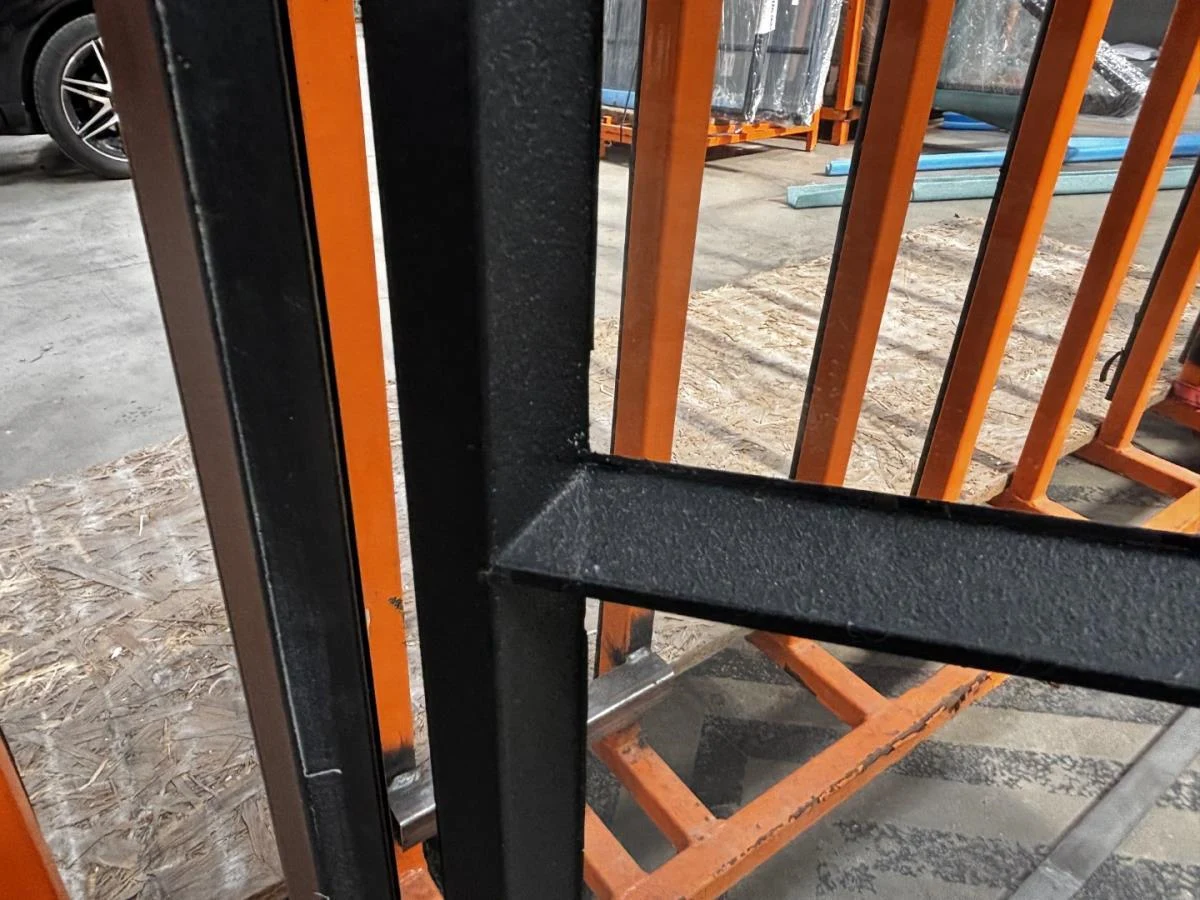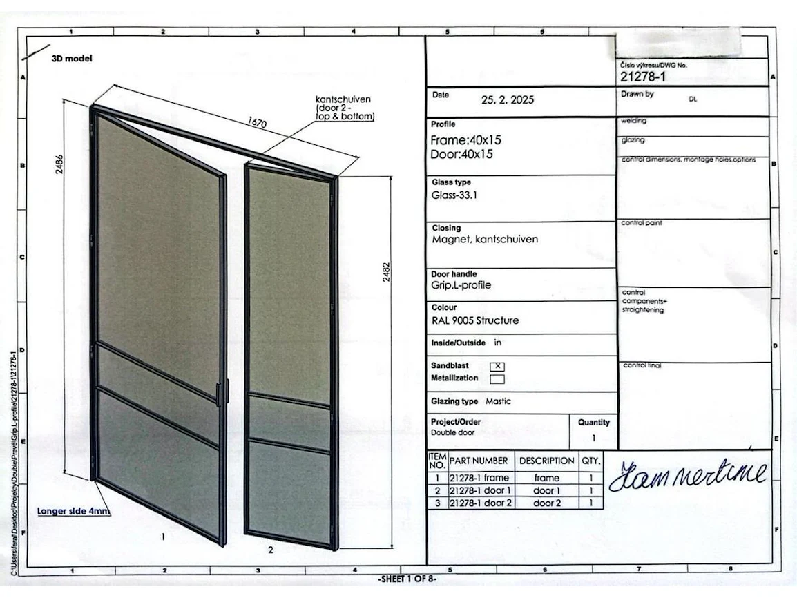 Stalen dubbele binnendeur voorzien van 3 onderverdelingen per deur Opgebouwd uit kokerprofielen 40 x 15mm Heldere veiligheidsbeglazing Gezandstraald en gepoederlakt RAL 9005 zwart Artisanaal afgemastikeerd aan 2 zijden HXB:2286x1670mm Verkoopprijs 3000€