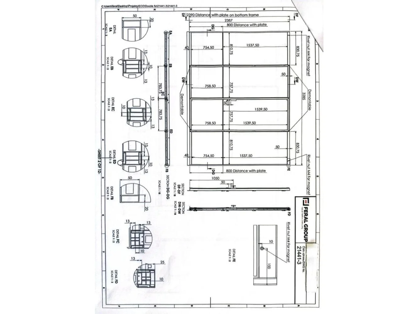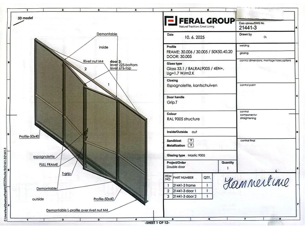 Dubbele stalen deur met 2 vaste zijlichten, opgebouwd uit thermische niet onderbroken Jansen profielen (dubbele dichting) gecombineerd met kokerprofielen 50mm 2 verdelingen per vleugel / paneel. Dubbele 4/8/33,2 Heldere veiligheidsbeglazing. Voorzien van een espagnoletsluiting De partij is GEMETALLISEERD waardoor ze perfect buiten kan worden geplaatst. Gepoederlakt in RAL 9005 zwart. Afmetingen: B3285 x H2387. Afgemastikeerd aan beide zijden. Verkoopprijs 6500€