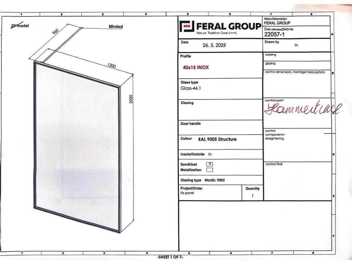 Douchewand opgebouwd uit inox profielen. Helder veiligheidsglas. Afmeting B1200 x H2000 voorzien van een stang om chemisch te verankeren in de muur. Kleur Ral 9005 zwart, afgemastikeerd aan 2 zijdenVerkoopprijs 2500€