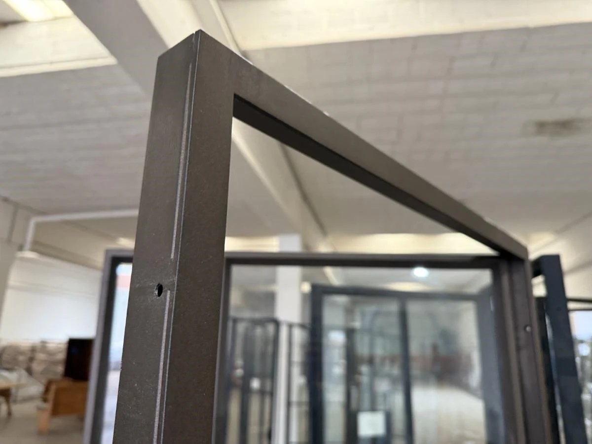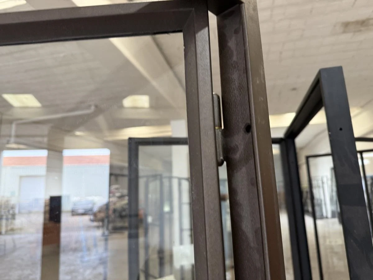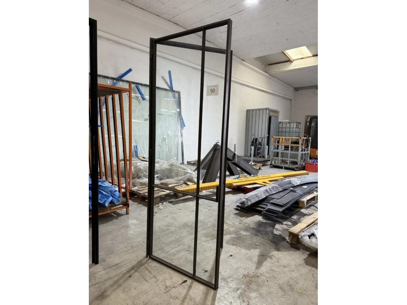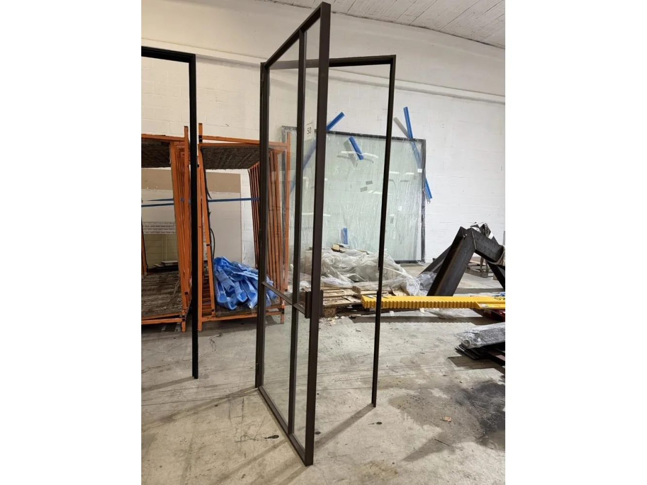 Stalen binnendeur voorzien van 4 onderverdelingen Opgebouwd uit kokerprofielen Heldere veiligheidsbeglazing Gezandstraald en gepoederlakt RAL AXALTRA BRONZE Artisanaal afgemastikeerd aan 2 zijden HXB:2005x771mm Verkoopprijs 1950€