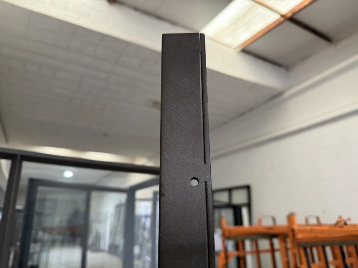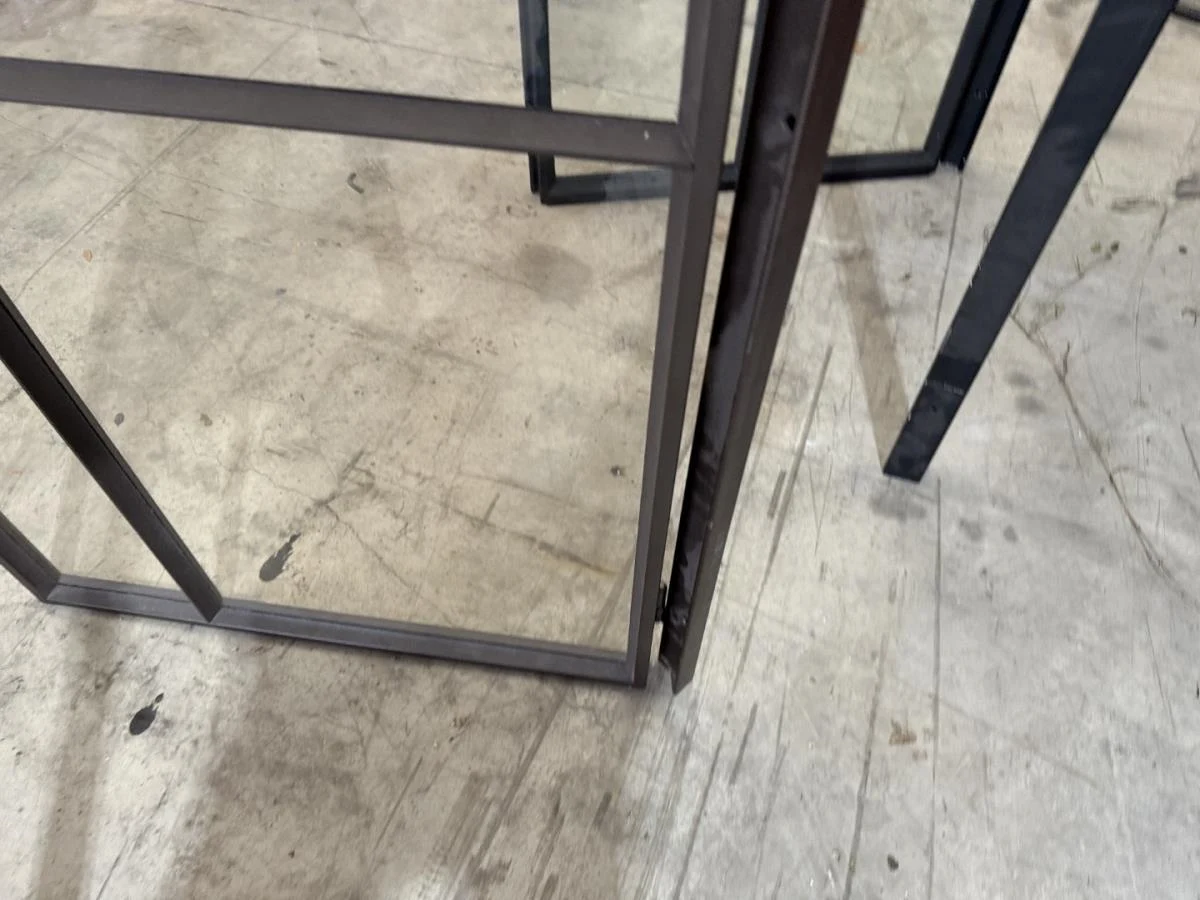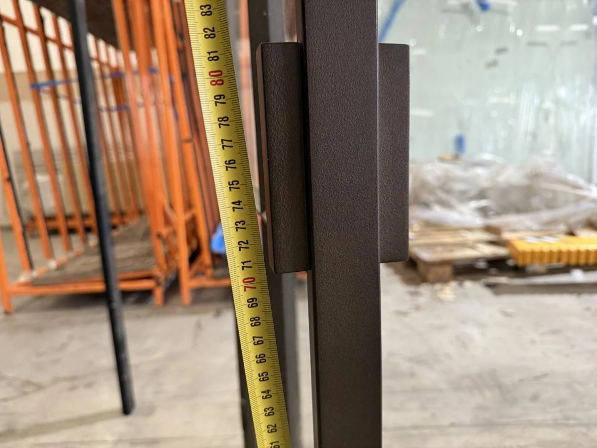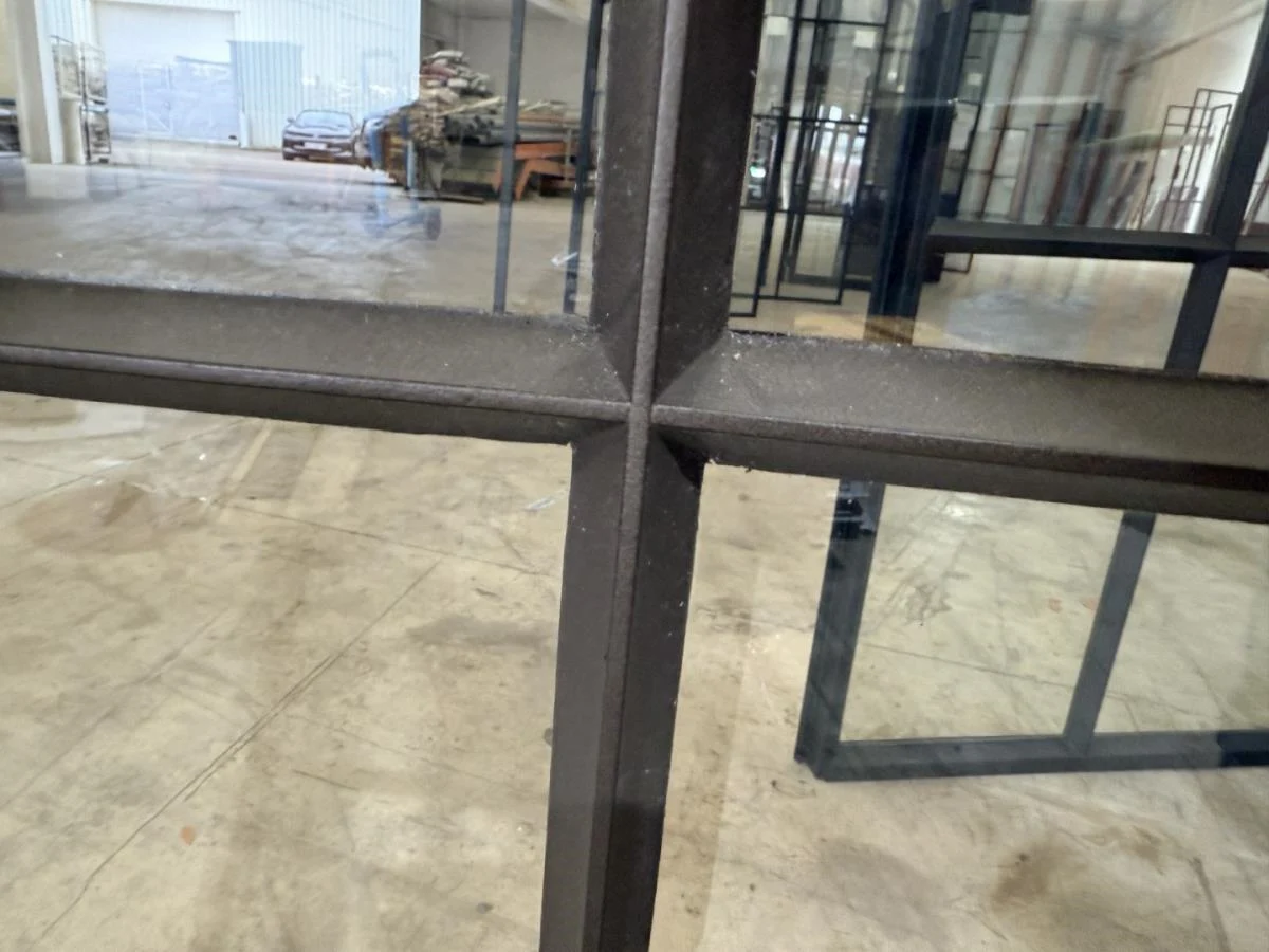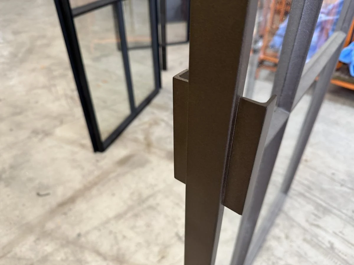 Stalen binnendeur voorzien van 4 onderverdelingen Opgebouwd uit kokerprofielen Heldere veiligheidsbeglazing Gezandstraald en gepoederlakt RAL AXALTRA BRONZE Artisanaal afgemastikeerd aan 2 zijden HXB:2005x771mm Verkoopprijs 1950€