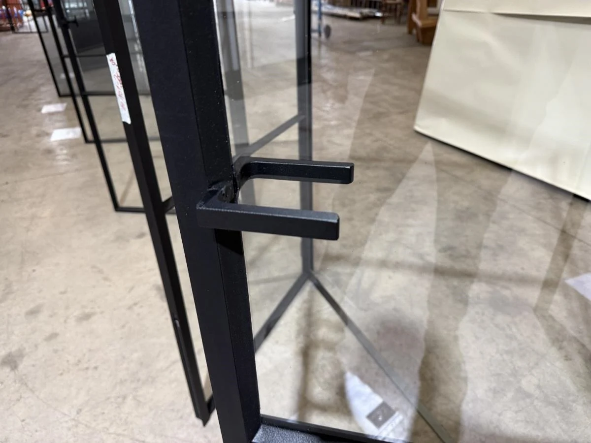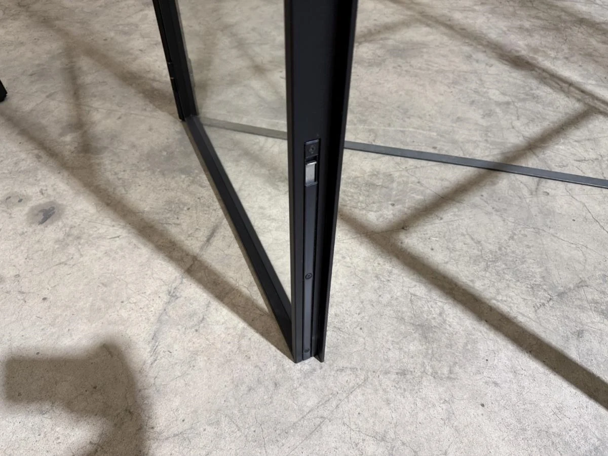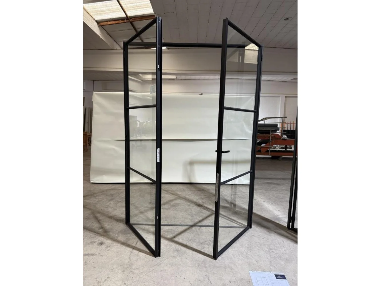 Stalen dubbele binnendeur voorzien van 3 onderverdelingen per deur Opgebouwd uit kokerprofielen 40 x 15mm Heldere veiligheidsbeglazing Gezandstraald en gepoederlakt RAL 9005 zwart Artisanaal afgemastikeerd aan 2 zijden HXB:2200x1600mm Verkoopprijs 2750€