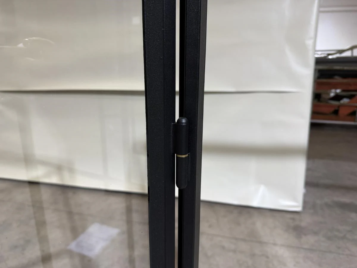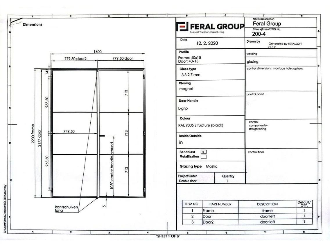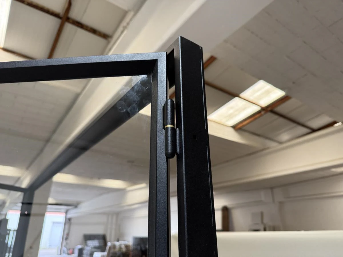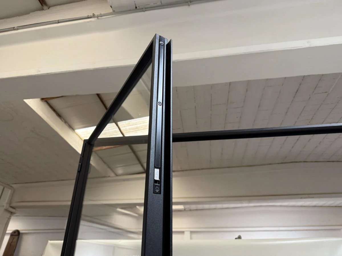 Stalen dubbele binnendeur voorzien van 3 onderverdelingen per deur Opgebouwd uit kokerprofielen 40 x 15mm Heldere veiligheidsbeglazing Gezandstraald en gepoederlakt RAL 9005 zwart Artisanaal afgemastikeerd aan 2 zijden HXB:2200x1600mm Verkoopprijs 2750€