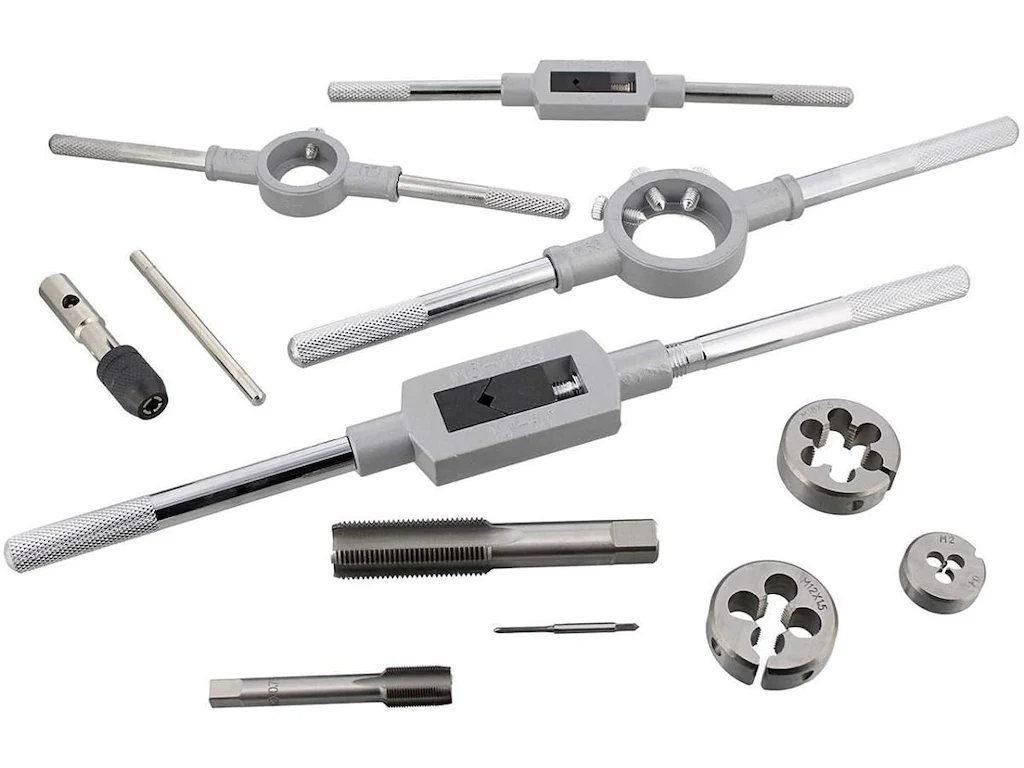 35 snijplaten in de volgende maten, M2 x 0,4 - M3 x 0,5 - M4 x 0,7 - M5 x 0,8 - M6 x 1,0 - M6 x 0,75 - M7 x 1,0 - M7 x 0,75 - M8 x 0,75 - M8 x 1,0 - M8 x 1,25 - M9 x 0,75 - M9 x 1,0 - M9 x 1,25 - M10 x 0,75 - M10 x 1,0 - M10 x 1,25 - M10 x 1,5 - M11 x 0,75 - M11 x 1,0 - M11 x 1,25 - M11 x 1,5 - M12 x 0,75 - M12 x 1,0 - M12 x 1,25 - M12 x 1,5 - M12 x 1,75 - M14 x 1,0 - M14 x 1,25 - M14 x 1,0 - M14 x 2,0 - M16 x 1,0 - M16 x 1,5 - M16 x 2,0 - M18 x 1,5. Met 2 Snijplaat houder, verstelbaar - 1 T-sleutel taphouder - 2 taphouders - 1 adapter. Gebruik Voor fijne schroefdraad voering.