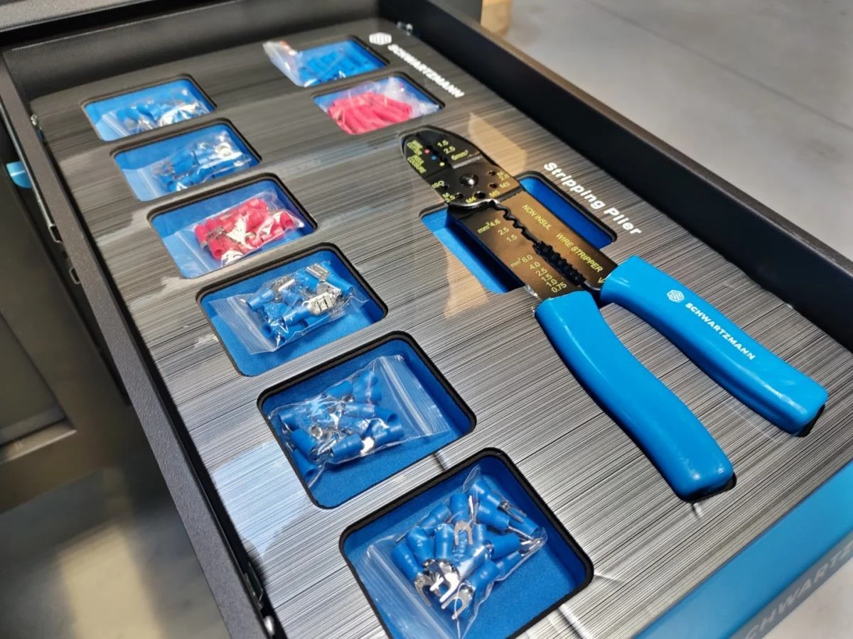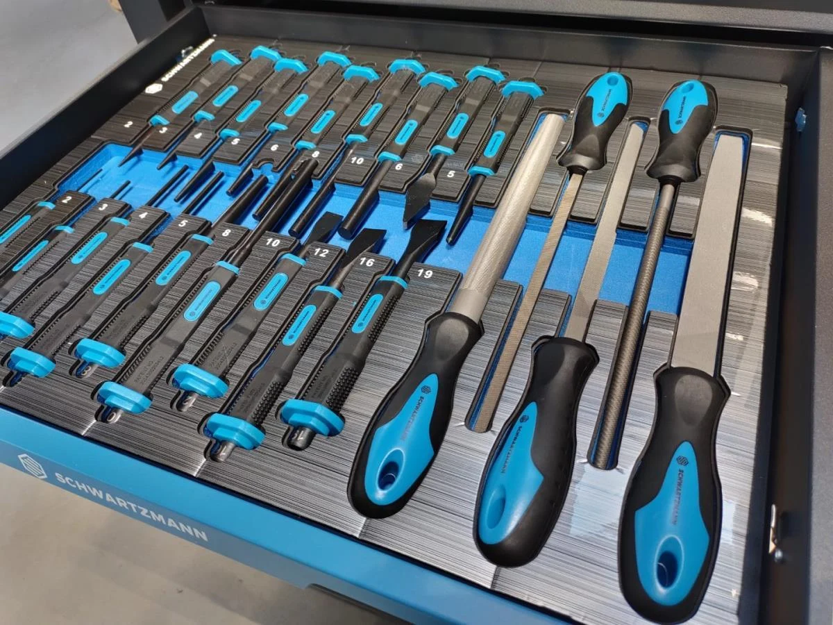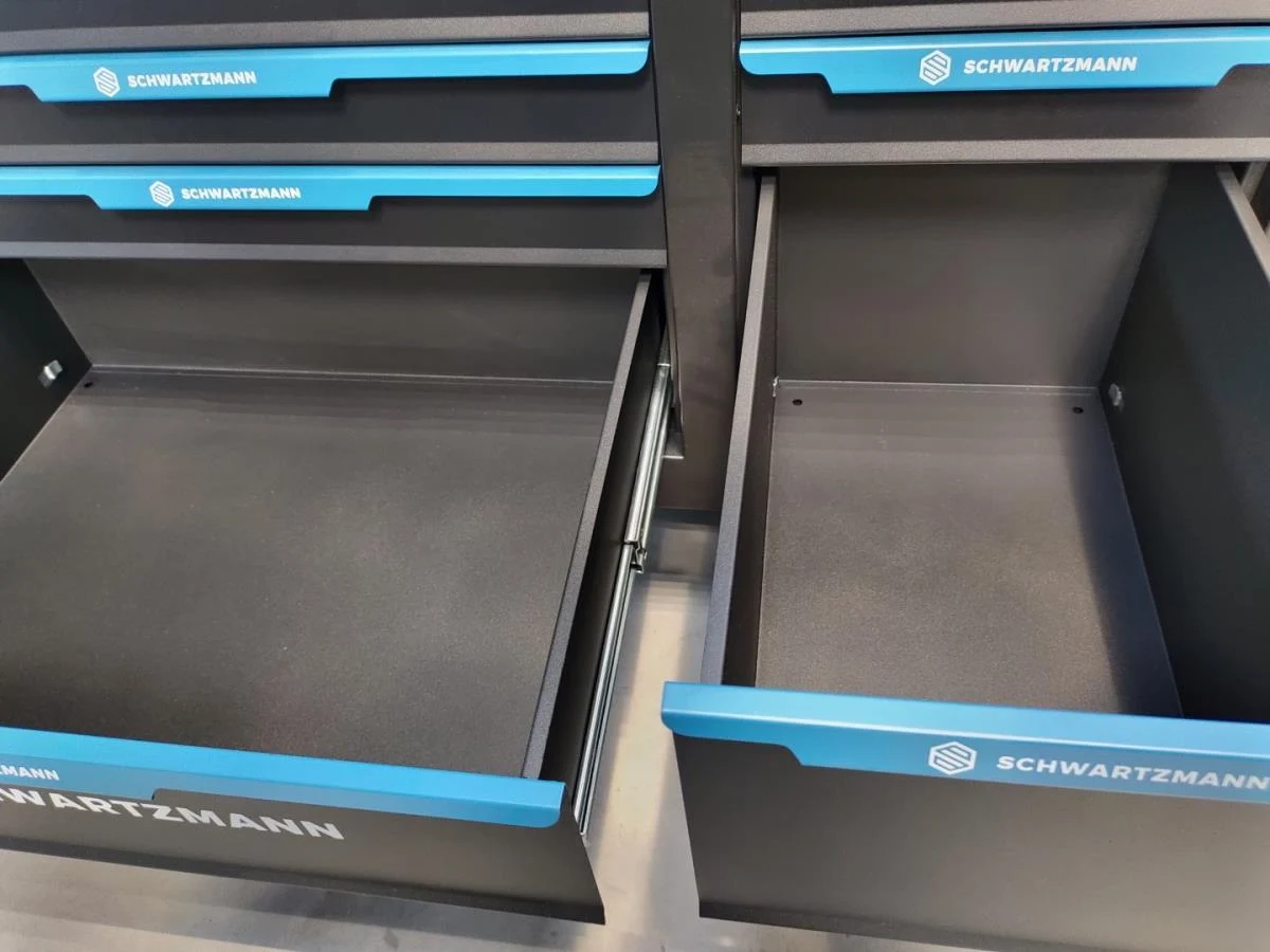 Unieke grote gereedschapswagen met 12 laden waarvan 10 laden gevuld met kwaliteits gereedschap, degelijke wagen met lades en wielen lopend op kogellagers, Houten bovenblad voor gebruik als werkbank, 1 meter breed,gewicht ca 120 kg, nieuw in doos