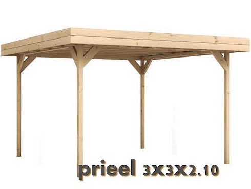 1x Priëeltje, afmetingen circa 308x340cm., hoogte 210cm., afm. geschikt voor 6 panelen, inclusief bouwtekening bouten schroeven en bevestiging, exclusief voet (zie andere kavels) en dakplaten (worden zonne collectors niet bijgeleverd) afschot zelf te bepalen dmv staanders 9x9x2,10 inkorten, , dakbalken 4,5x14,5alles geïmpregneerd/gegalvaniseerd fotos zijn voorbeeldfotos