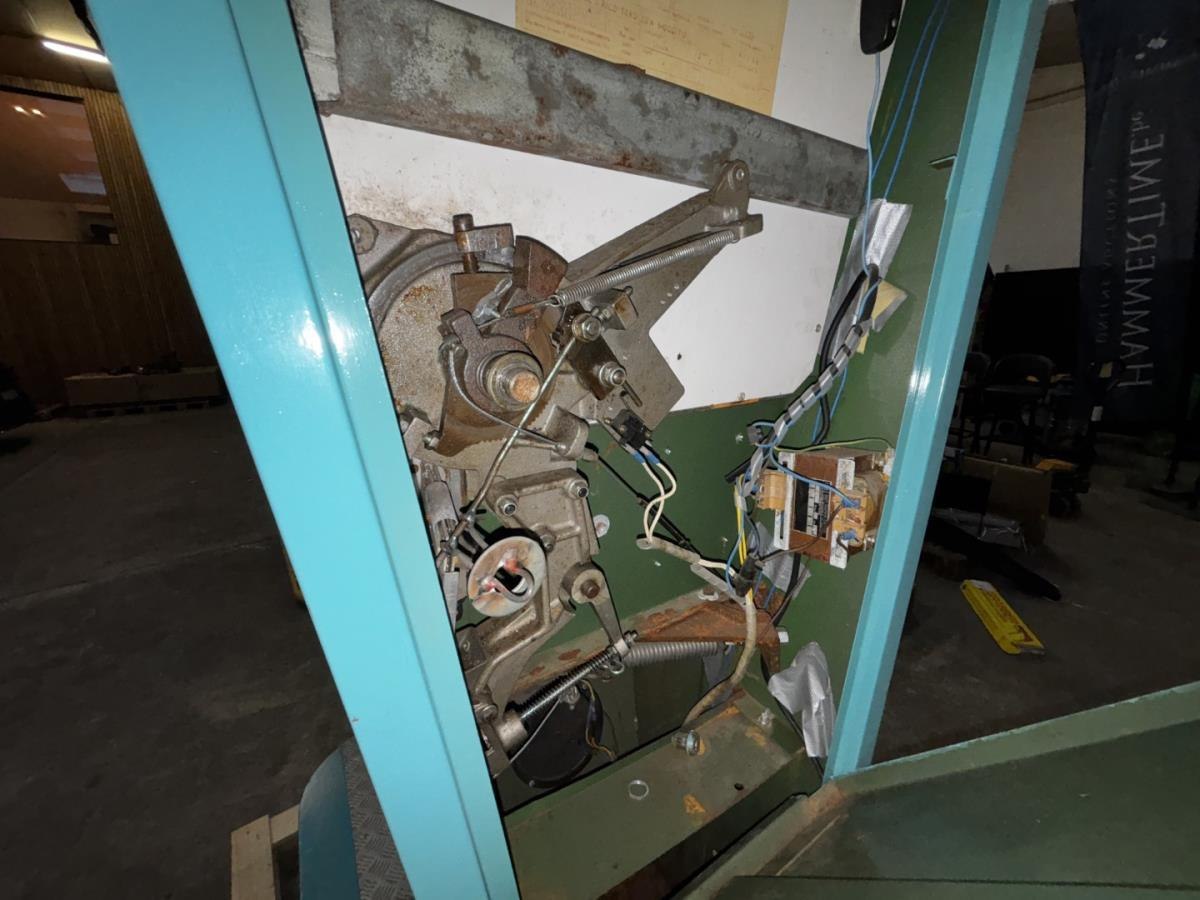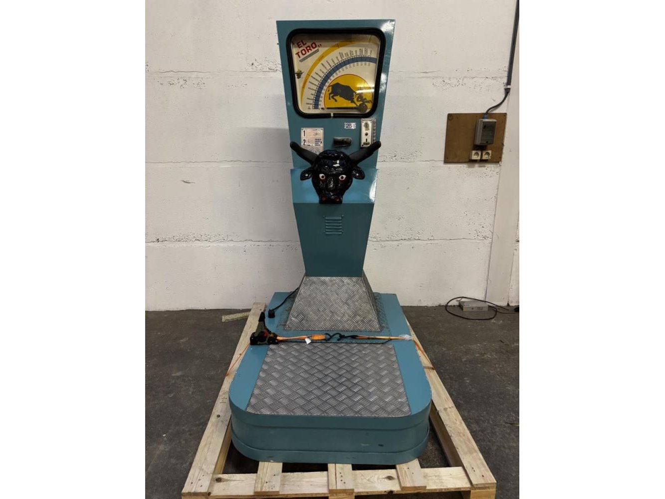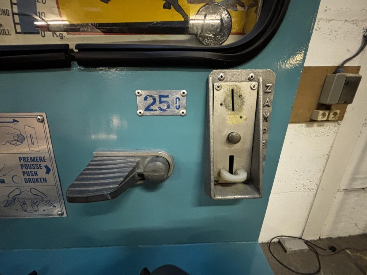 Dit is een Zamperla El Toro Strength Tester, een klassiek kermis- of arcade-spel. Speldetails Type spel: Dit is een amusementsautomaat om de grijpkracht te testen, vaak te vinden op kermissen, in speelhallen of bij evenementen. Gameplay: Spelers grijpen de hoorns van de stier vast en knijpen zo hard mogelijk. De meter op het display beweegt en registreert de kracht. Krachtniveaus: De resultaten op de wijzerplaat variëren en tonen verschillende krachtniveaus, van "Suckling" (zuigeling/zwak) tot "Ursus" of "Superman" (zeer sterk). Fabrikant en tijdperk: Deze specifieke machine is gemaakt door Zamperla, een bekende fabrikant van attracties en arcade-spellen. Modellen zoals deze dateren vaak uit de jaren zestig (ca. 1960). Conditie: Het afgebeelde model is een vintage muntbediend exemplaar , gemonteerd op een houten pallet voor transport of opslag. OPGELET: dit is te bewonderen op afspraak in de magazijn van Hammertime!