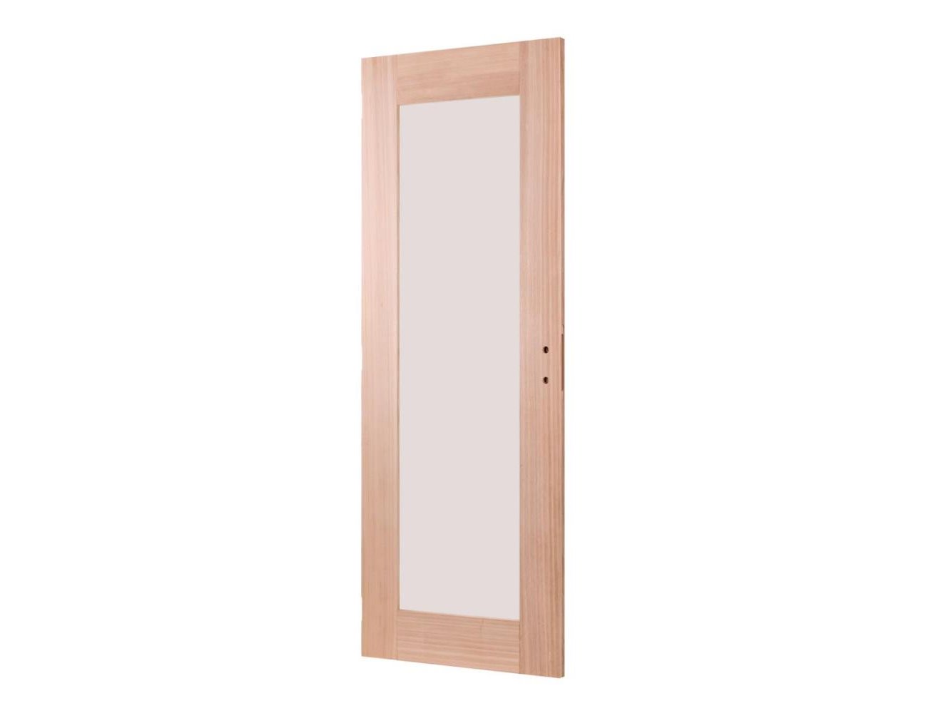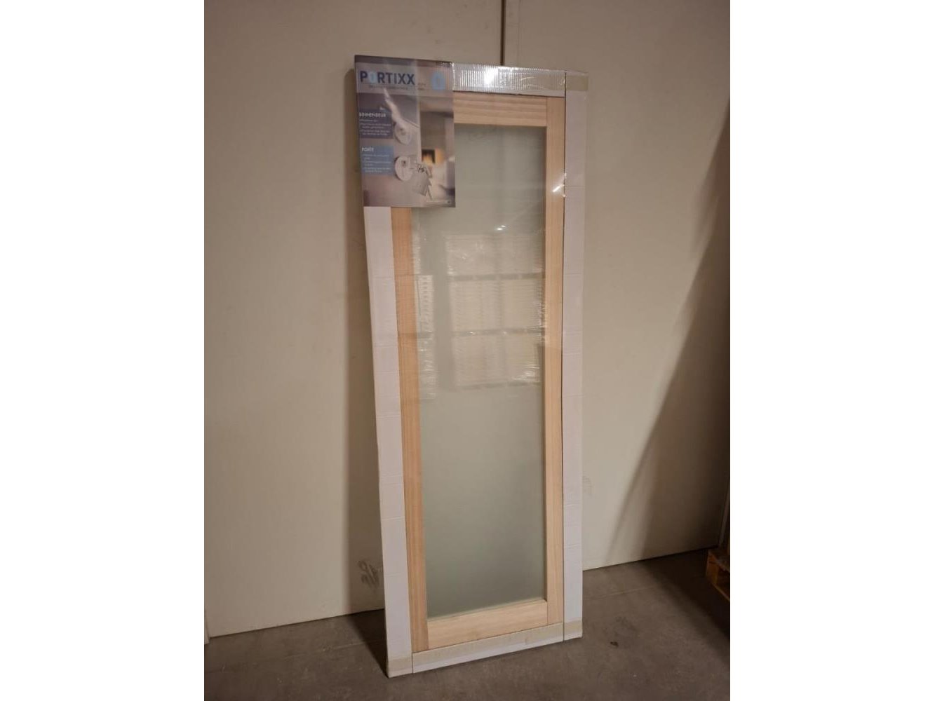 2 binnendeuren, zonder kozijnset, in massief hout, beglaasd in mat glas. Te combineren met een bestaand kozijn of nieuw kozijn. Deur reeds voorzien van frezingen voor slot en scharnieren.