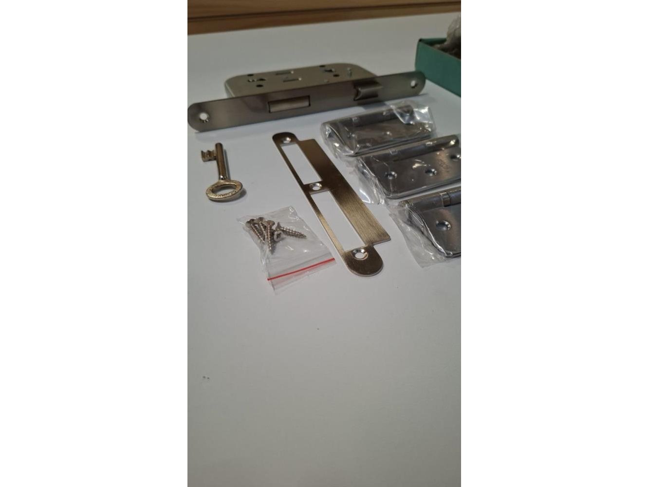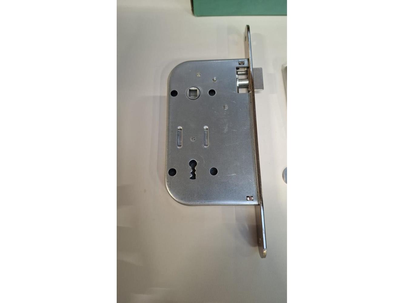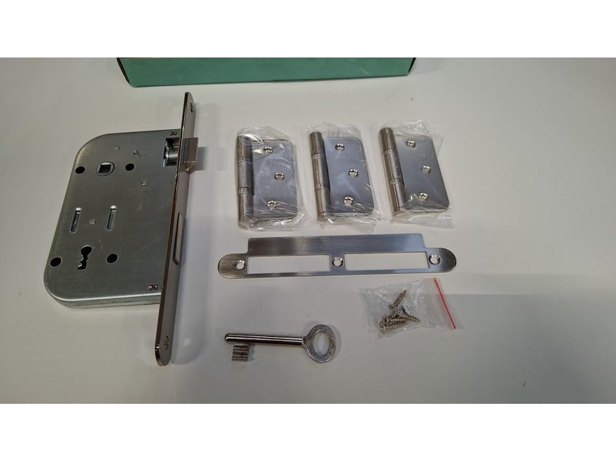 Doos van 20 sets ‘slot & scharnieren’. In een set bevinden zich volgende onderdelen: - Slot (ax 72/60) - 3 scharnieren (80/80) - Patentvijzen - Schroeven Slot en scharnieren zijn in inox uitvoering.