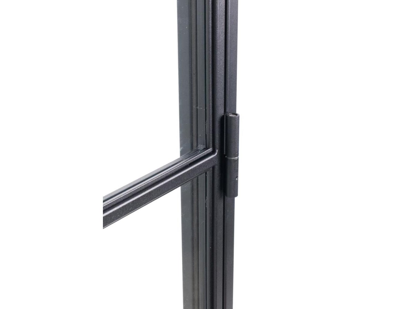 Stalen deur in zwarte poederlak met helder glaspartijen. De deur is opgebouwd met een zwart gepoederlakt paneel en daarboven een 6-glasverdeling. Omwille van een magnetische strip over de volledige lengte van de deur, is geen slotmechanisme nodig en sluit de deur gemakkelijk tegen de magneet op de aanslag. De kleine elegante trekker zorgt ervoor dat je de deur makkelijk kan openen en sluiten. - De afmeting van de deur is 50mm(D) x 880mm(B) x 2140mm(H) - Deze is linksdraaiend (Belgische norm)