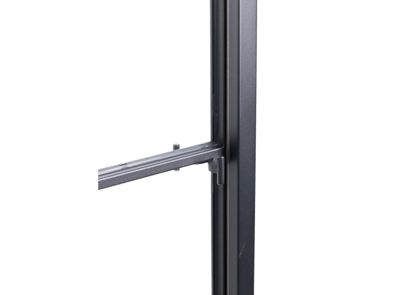 Stalen deur in zwarte poederlak met helder glaspartijen. De deur is opgebouwd met een zwart gepoederlakt paneel en daarboven een 6-glasverdeling. Omwille van een magnetische strip over de volledige lengte van de deur, is geen slotmechanisme nodig en sluit de deur gemakkelijk tegen de magneet op de aanslag. De kleine elegante trekker zorgt ervoor dat je de deur makkelijk kan openen en sluiten. - De afmeting van de deur is 50mm(D) x 880mm(B) x 2140mm(H) - Deze is rechtsdraaiend (Belgische norm)