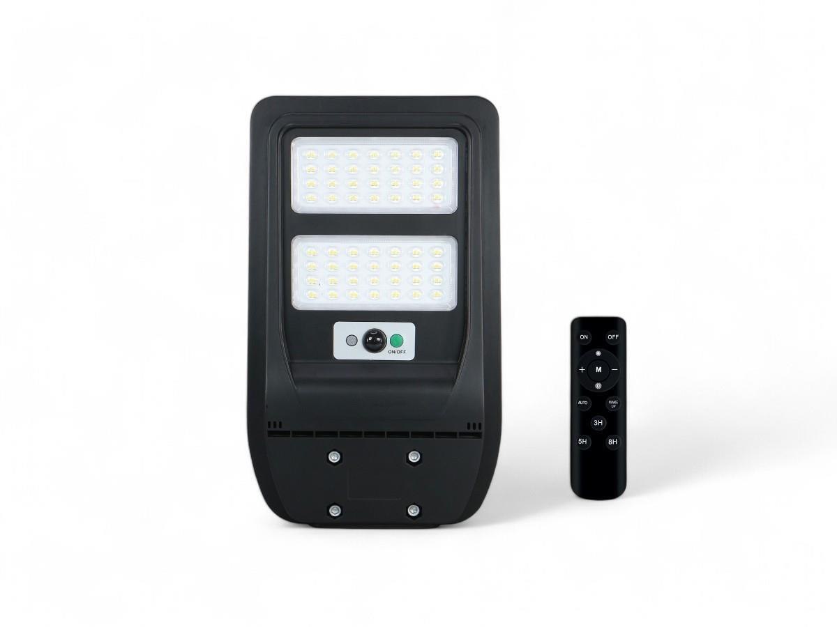 2 x Solar 5000K LED Straatverlichting met Microwave Sensor en Afstandsbediening - lichtkleur daglicht 5000K - waterdicht IP65 - lichtstroom max 750 lumen - product kleur zwart - afm 401.7 x 236.7 x 43mm - stralingshoek 90° - behuizing PC en ABS - zonnepaneel voltage 6V - batterij 5Ah - met microwave sensor - met afstand bediening kan dimmen en timer instellen - werkt totaal meer dan 12uur - bescherming tegen mechanische inslagen IK07 - wandbeugel en bevestiging niet inclusief - sku 1123S