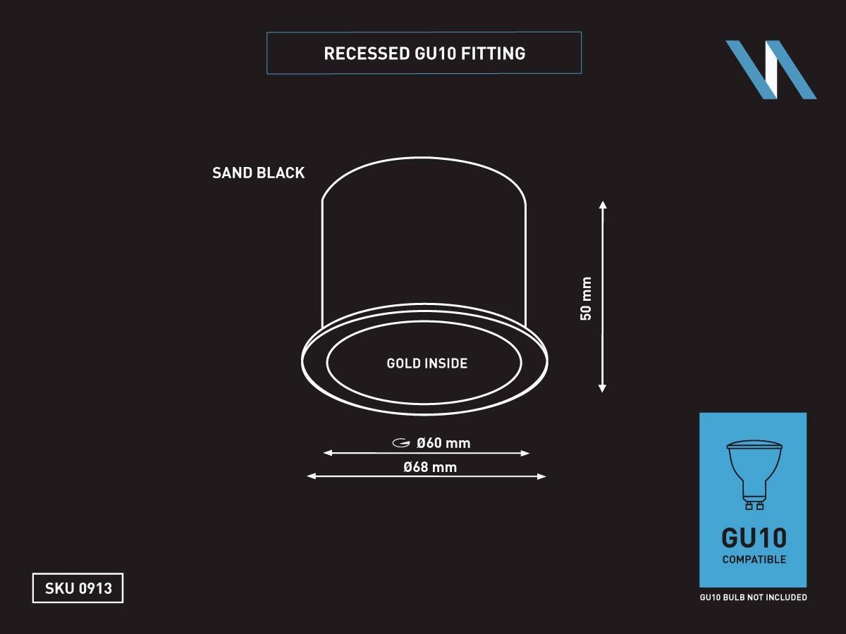 50 x GU10 Inbouw design armatuur cilinder zand goud en zwart met lamphouder - afdichting IP20 - product kleur zand goud zwart - afm. Ø 68 x 50mm - inbouwdiameter ø 60mm - materiaal aluminium - fitting GU10 - inclusief keramiek lamphouder - lichtbron bulb niet inclusief - geschikt voor binnen - een bulb invoer - voltage 220-240V - SKU 00913 SKU353