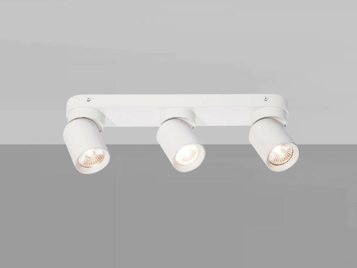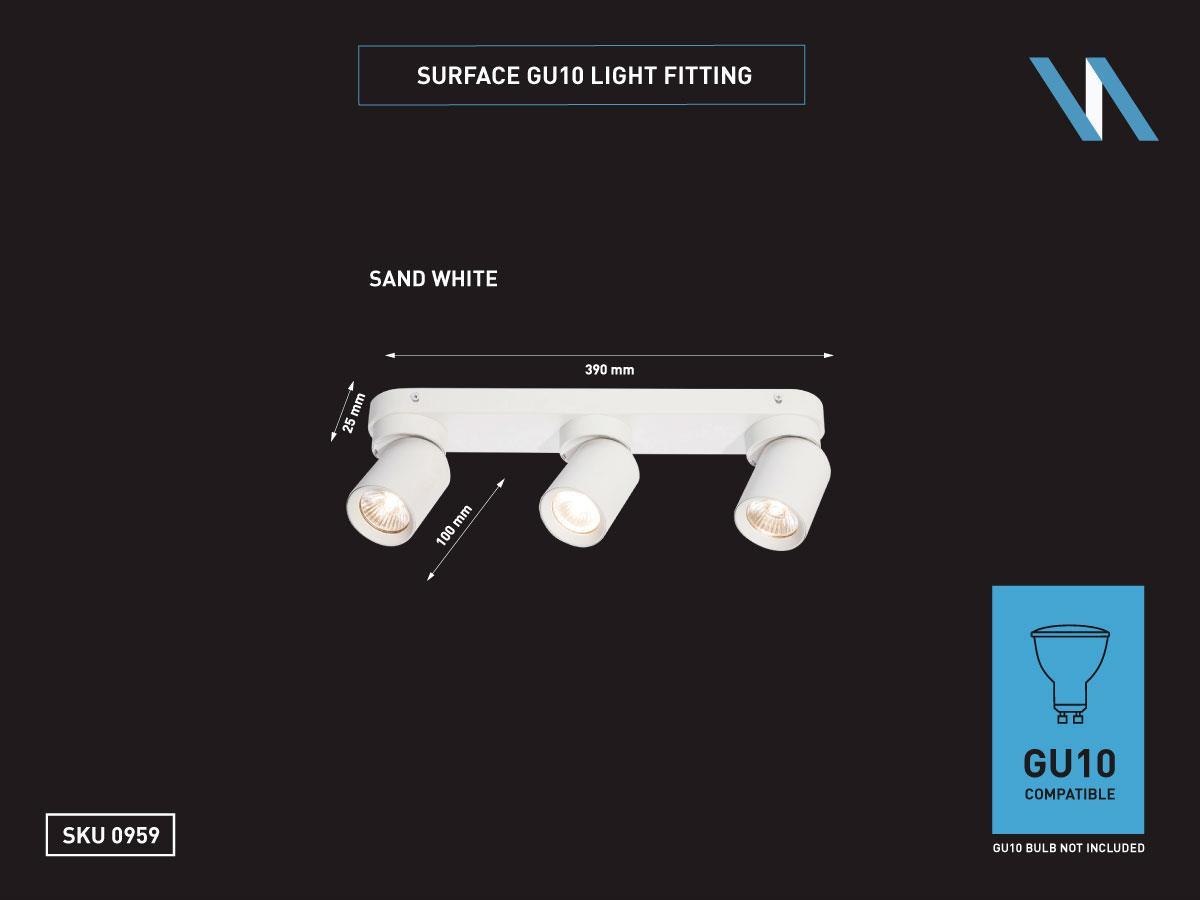 4 x GU10 Opbouwspot Armatuur triple cilinder zand wit draaibaar - afdichting IP20 - product kleur zand wit - afm. Ø 60 x 100mm - afm wandhouder 390 x 60 x 25mm - draaibaar 350° en kantelbaar 50° - materiaal aluminum en ijzer - bevestiging inclusief - fitting GU10 - bulb niet inbegrepen - geschikt voor binnen - 3 x bulb invoer - voltage 220-240V - max 40 watt - SKU 00959