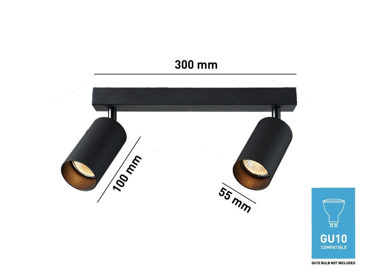8 x GU10 Opbouwspot Armatuur dubbel zwart draaibaar - afdichting IP20 - product kleur zand zwart - afm. Ø 55 x 100mm - afm wandhouder 300 x 50mm - draaibaar 350° en kantelbaar 90° - materiaal aluminum en ijzer - bevestiging inclusief - fitting GU10 - bulb niet inbegrepen - geschikt voor binnen - 2 x bulb invoer - voltage 220-240V - max 35 watt - SKU 00846