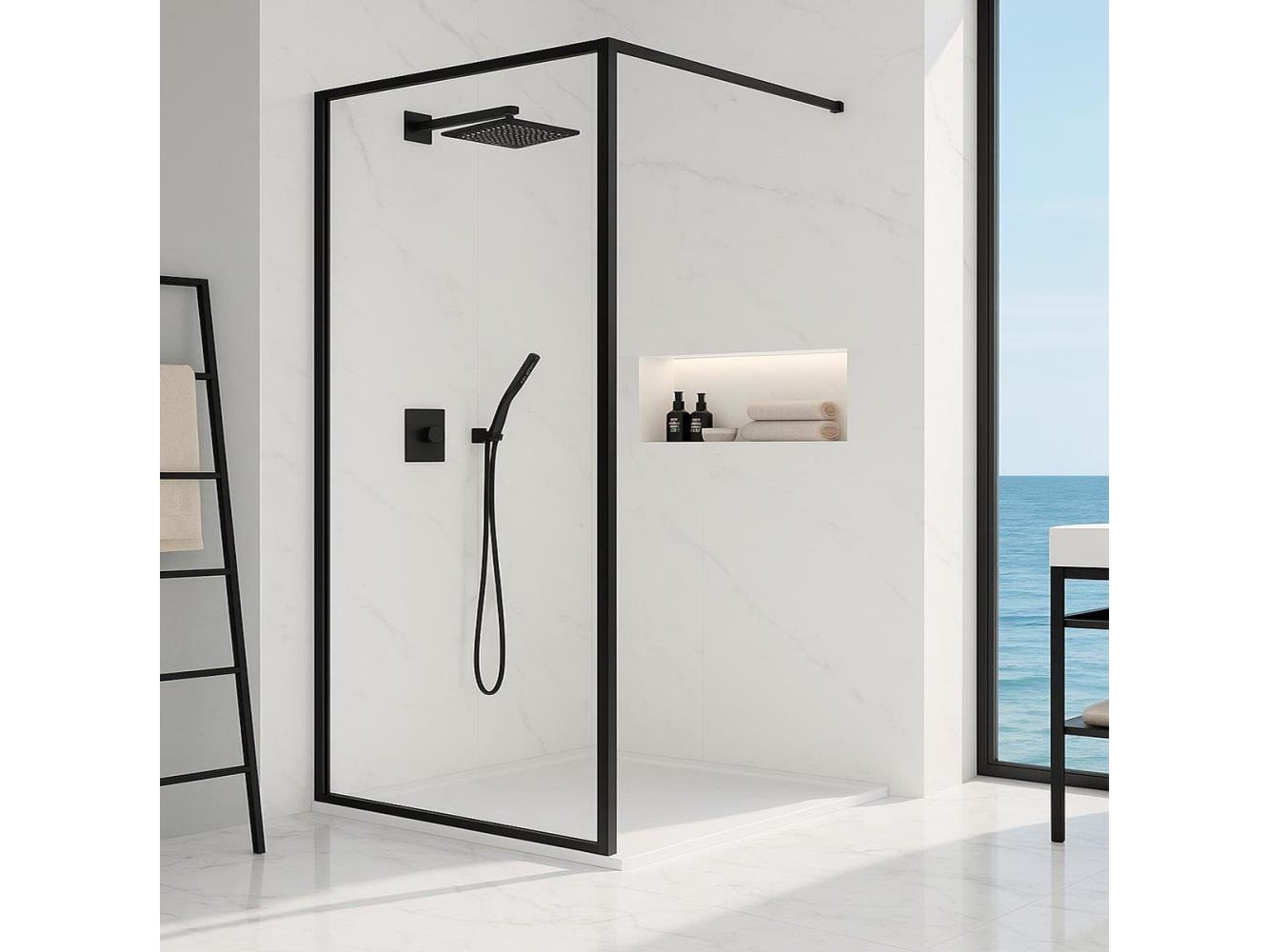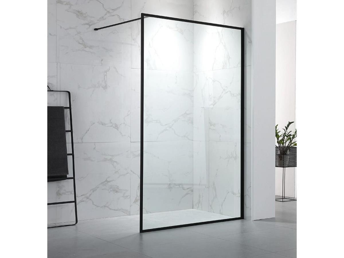 1 x 120 x 200 - Antikalkbehandeling - NANO-EASY CLEANING GLAS; B 1160 x H 2000 mm - Mat zwart kader profiel breedte 25 mm - Mat zwart muur profiel breedte 30 mm - Veiligheidsglas Glasdikte 8 mm - 100 cm zwart stabilisatiestang inclusief - 120BCF