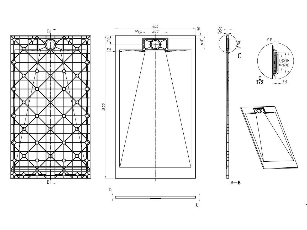 1 x SMC douchebak 90x140CM -Mat zwart - lage instap - sifon inbegrepen