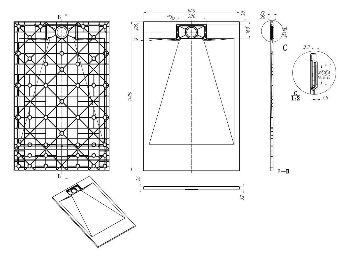 1 x SMC douchebak 90x140CM - Mat wit - lage instap- sifon inbegrepen