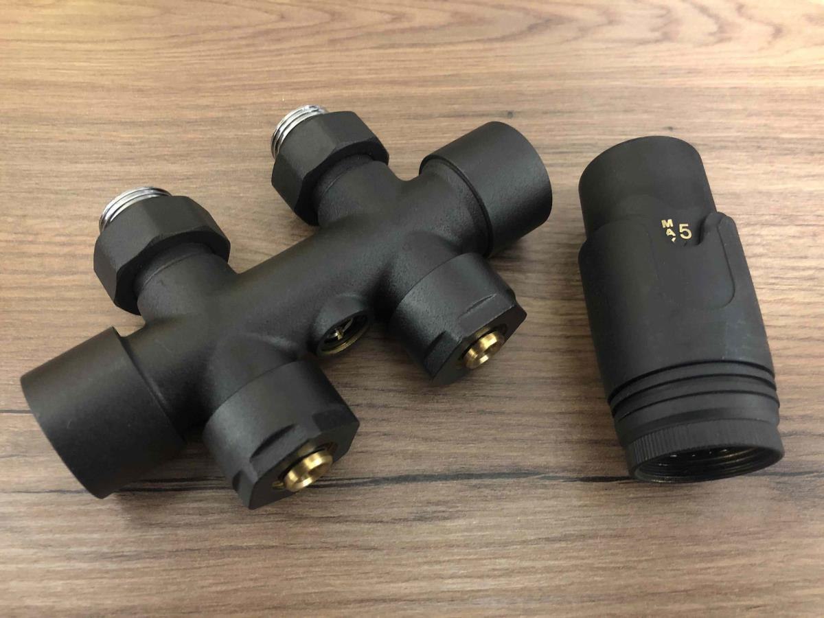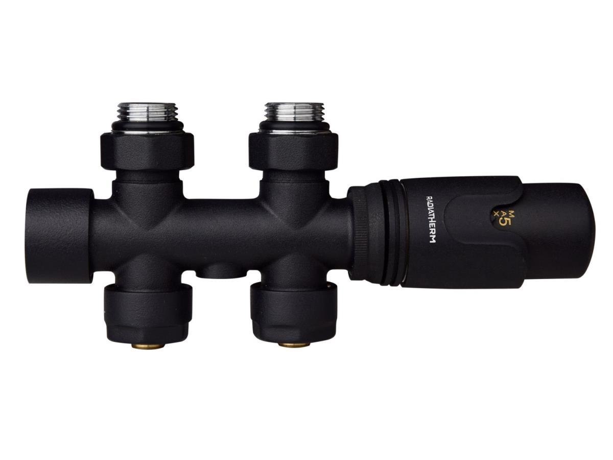 1 x Thermostatische design kraanset met middenaansluiting uit vloer (recht) - Omkeerbaar - Kleur zwart - Met 16mm knelset - Voor badkamerradiatoren en design radiatoren - DB-1