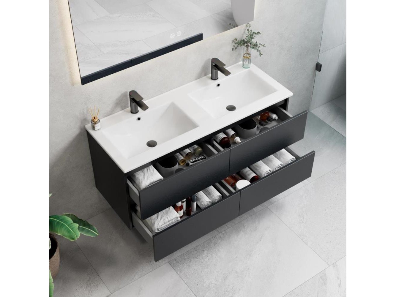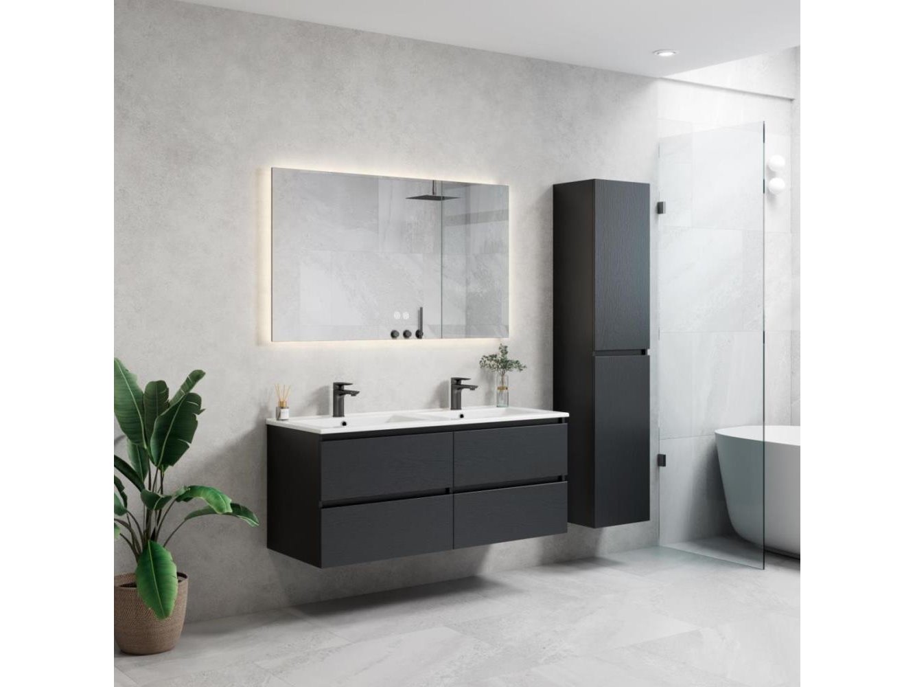 1 x 120 cm Design Badkamermeubel - ROMA 120-06 - Melamine - Kleur: Zwart Eik- Afm. B120xH50xD46CM - LED Spiegel 120x70cm (Verschillende kleurtemperaturen 3000K Warm-wit, 4000K Neutraal-wit, 6500K Koud-wit) + Anti Condens + Alle 3 de kleuren zijn dimbaar, zo kunt u het licht eenvoudig dimmen of feller maken tot het gewenste effect - Mineraalmarmer wastafel- de onderbouwkast van het badkamermeubel bevat 4 laden en is uitgevoerd met een soft close systeem - kraan, krepin, sifon en kolomkast niet inbegrepen