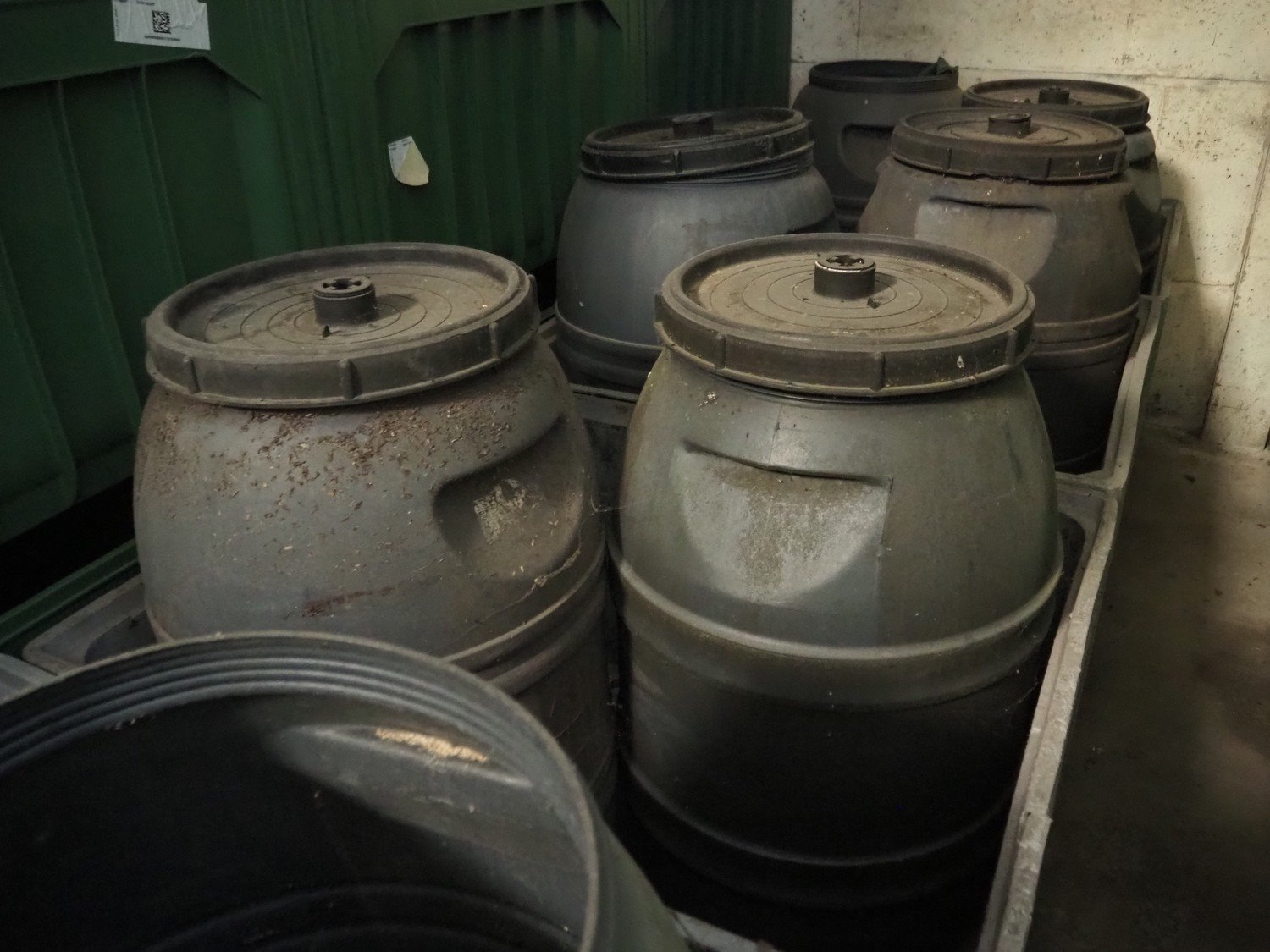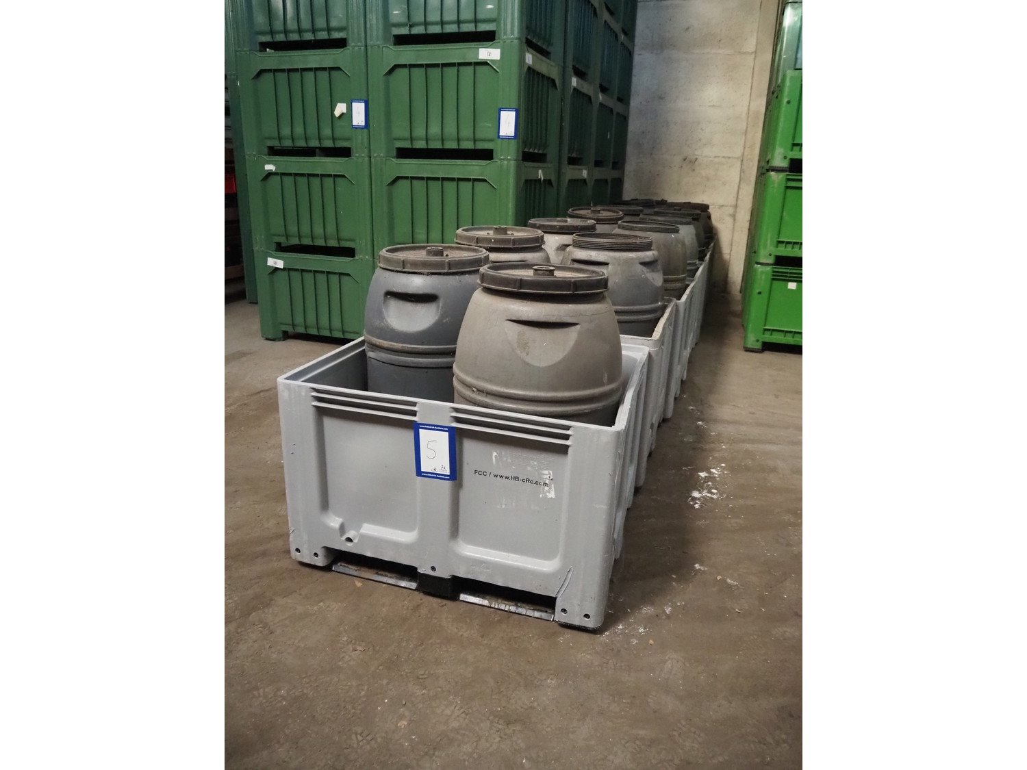 7 plastic pallet boxes with 14 plastic barrels, pallet box dimensions: (7x) 1200 mm x 1000 mm x 770 mm, barrel dimensions: (14x) Ø 600 mm x 1000 mm. Missing 4 lids. Kavel locatie: Patrijsstraat 10, 3920 Lommel, België