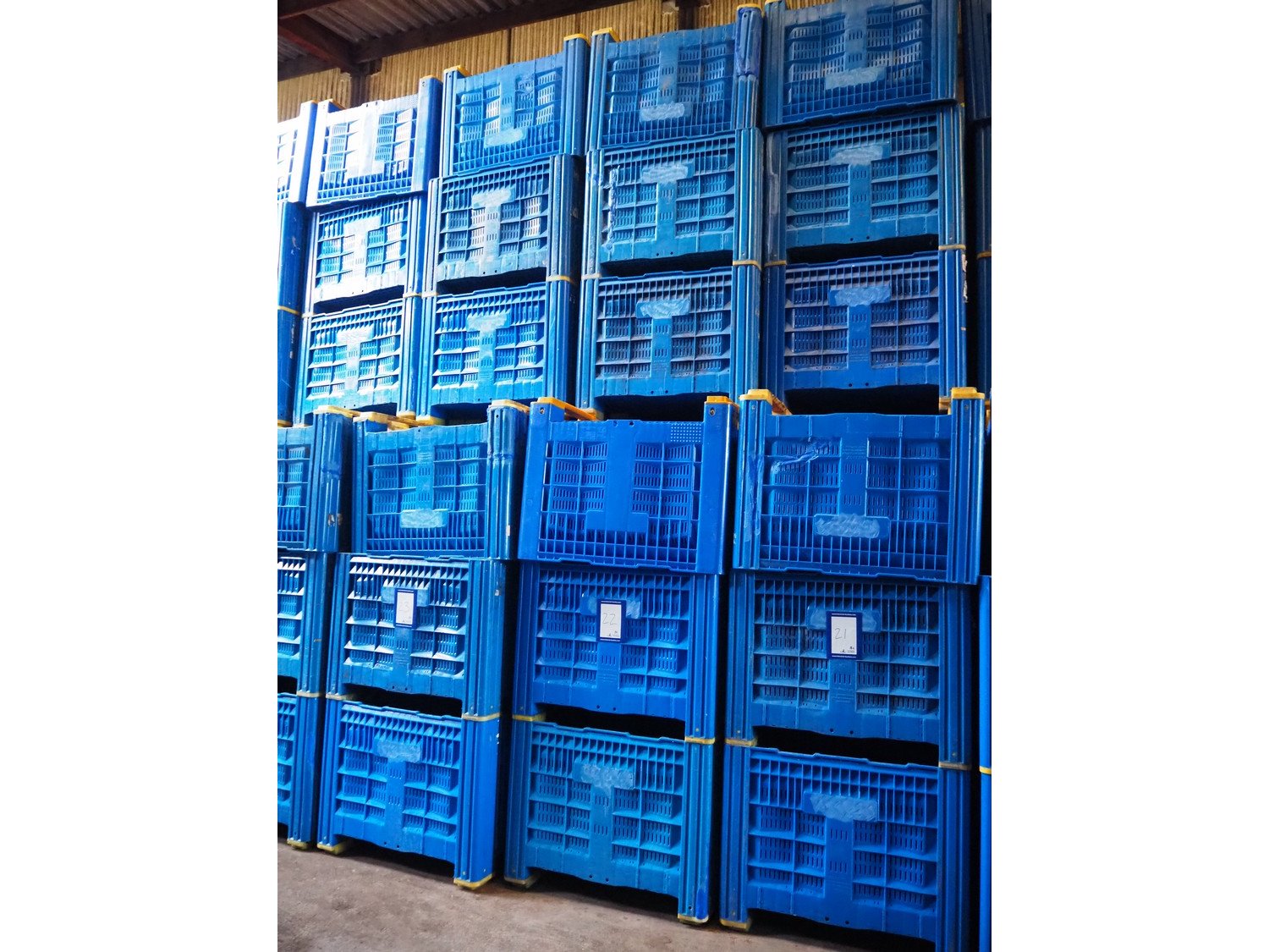 18 plastic pallet boxes, dimensions: (18x) 1190 mm x 990 mm x 760 mm. Kavel locatie: Patrijsstraat 10, 3920 Lommel, België