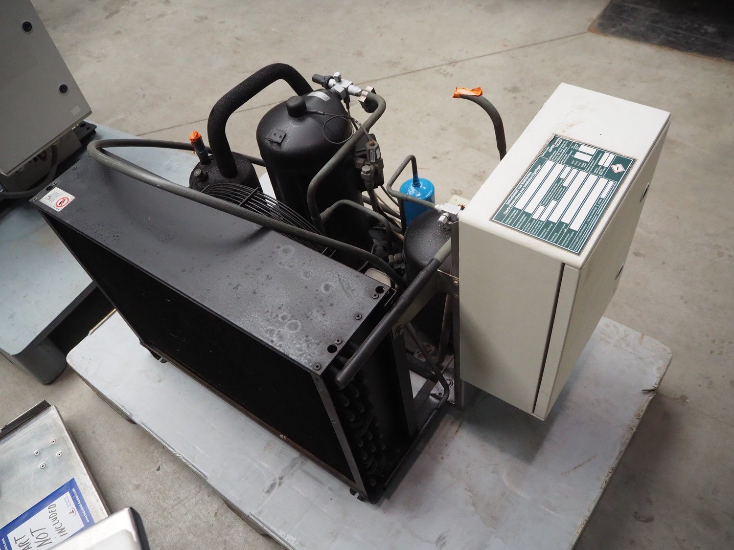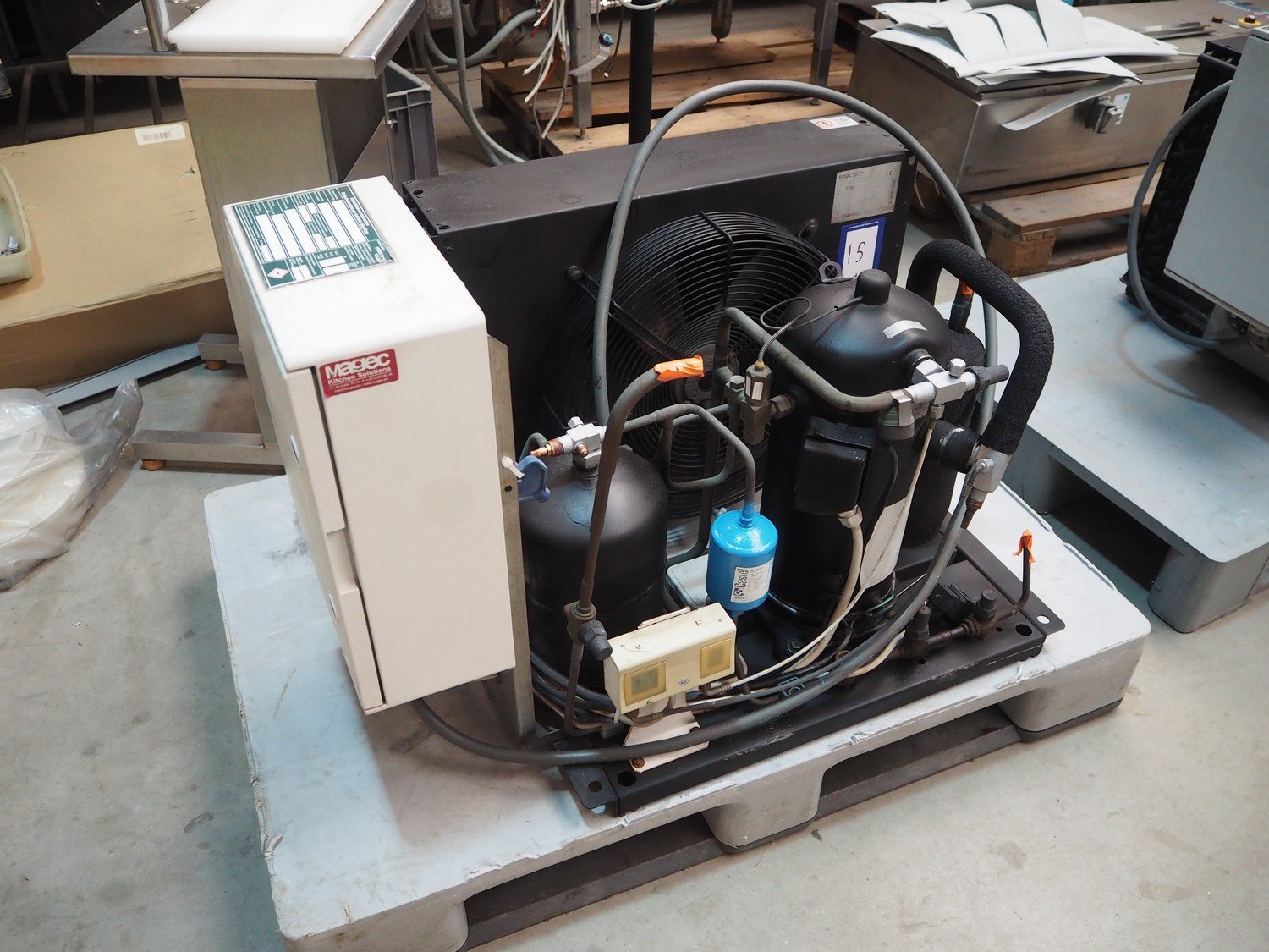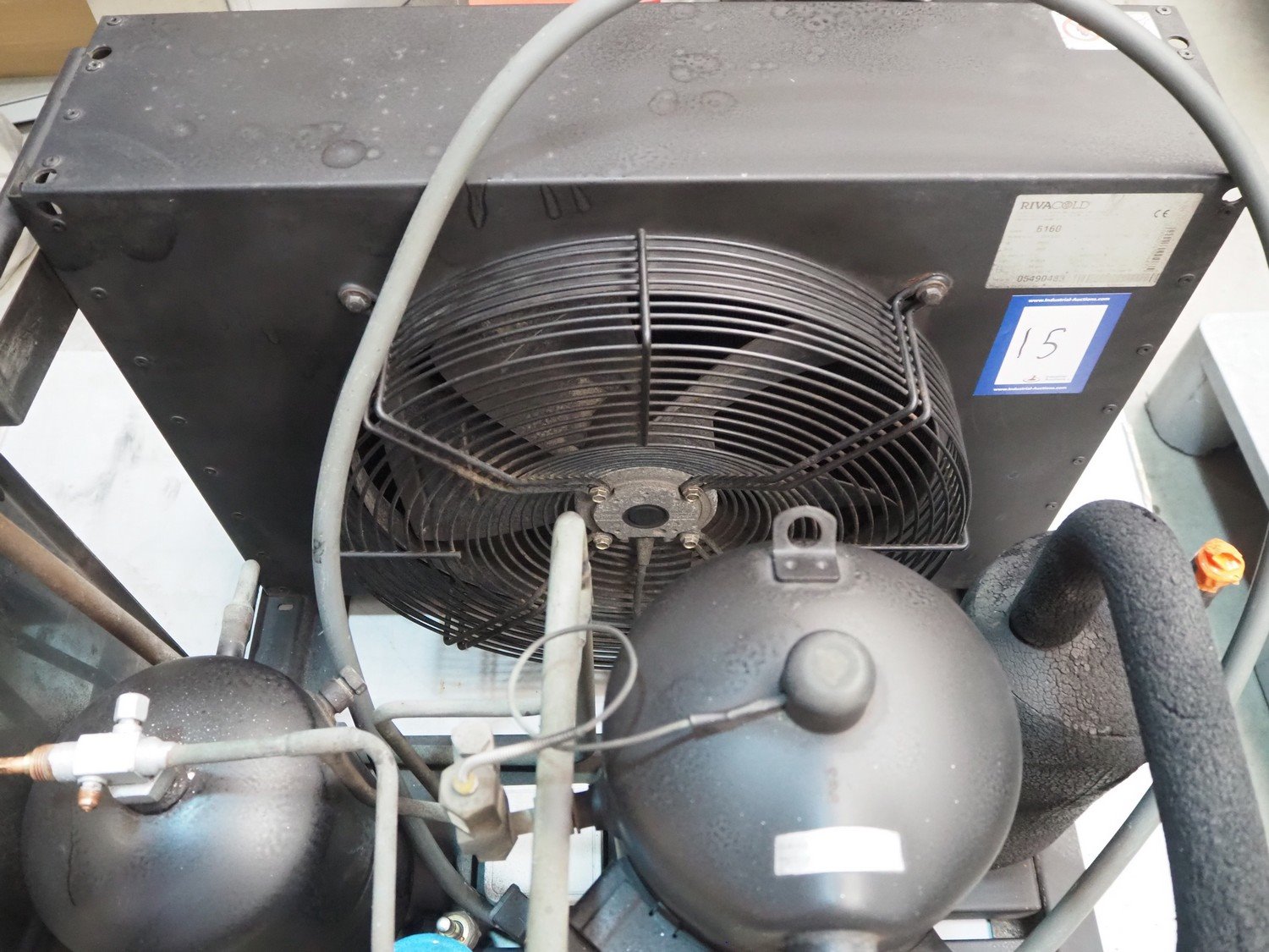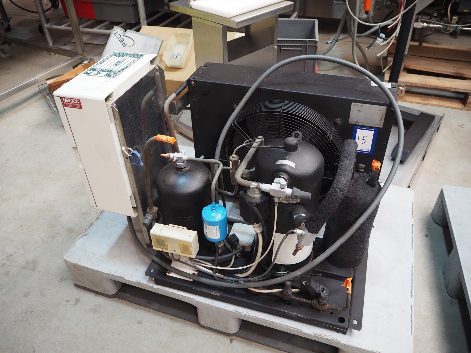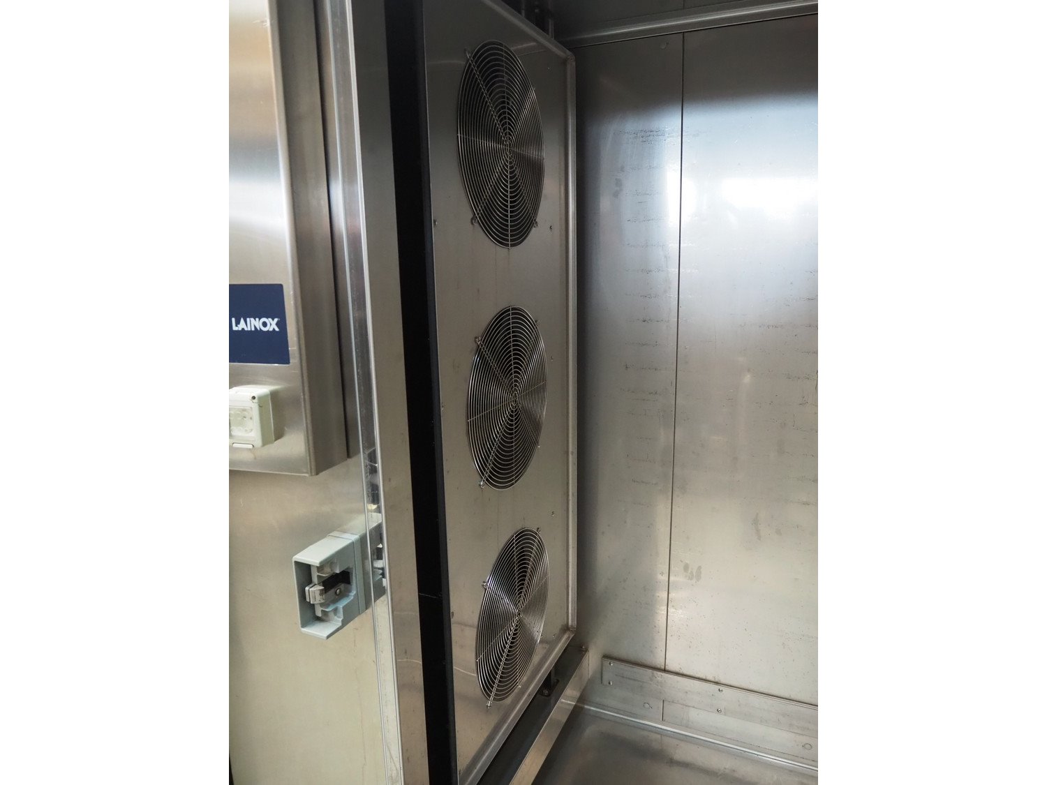 Lainox blast chiller, model: DBMC40T, 400 V, 3 Ph, 50 Hz, 5540 W, refrigerant: R404a / 7500 gram, inside dimensions: 960 mm x 810 mm x 1850 mm, total dimensions: 1400 mm x 1240 mm x 2350 mm. Including Rivacold refrigeration unit. type: 6160, serial number: 05490483, 400 V, 3 Ph, 50 Hz, 6.14 A, 2940 W, refrigerant: R404A, dimensions: 900 mm x 600 mm x 650 mm. Kavel locatie: Beukenhofstraat 77A, 8570 Anzegem, België